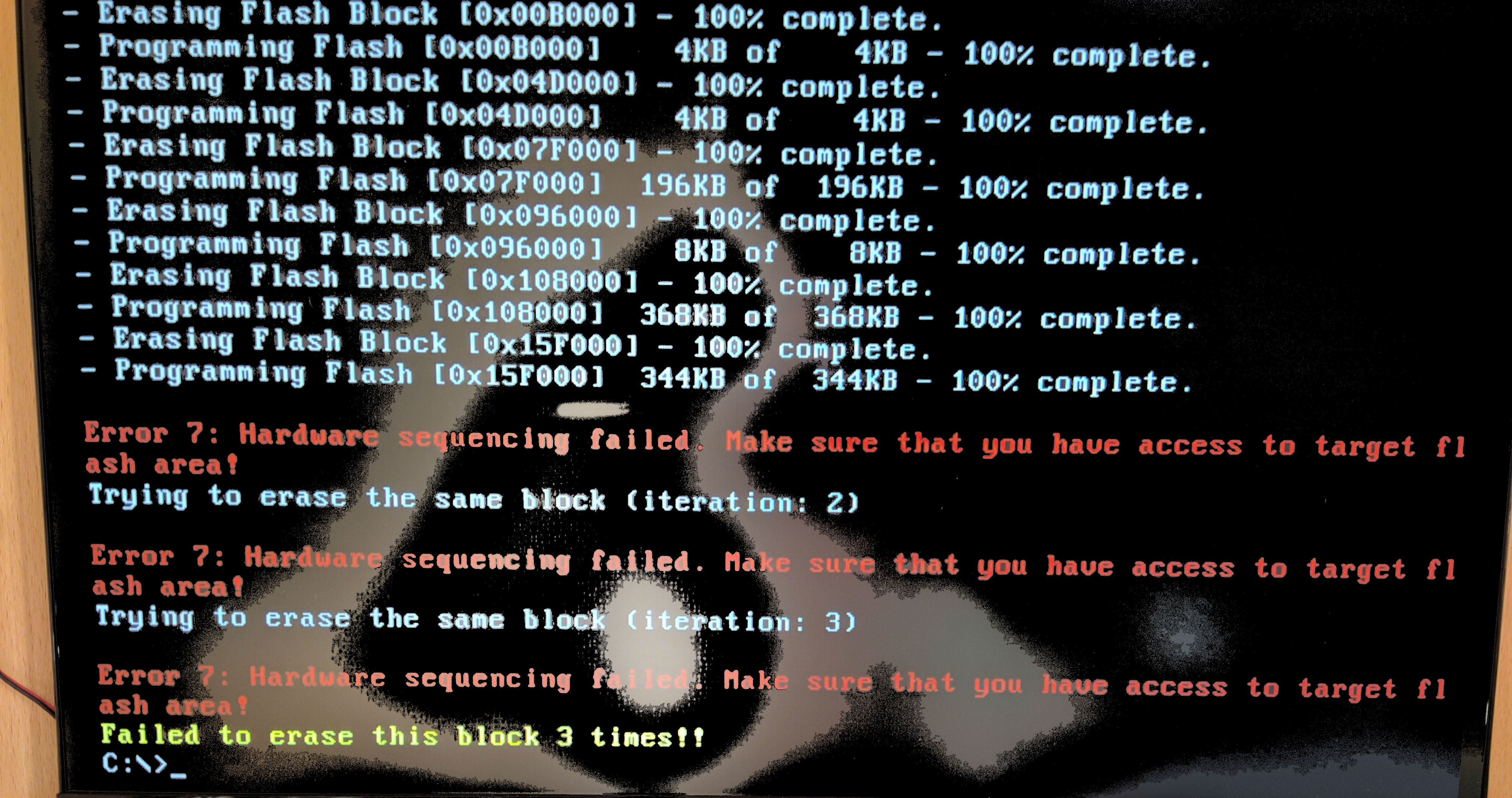 так вот потом немедленно своим бэкапом по 2 раза прошёлся и фпт и афудом(в конце), вот только на моём бэкапе тоже такие ошибки валились, а афудос нормально прошил вырубил комп, вытащил батарейку, все собрал, настроил, все работает, двойных стартов нет