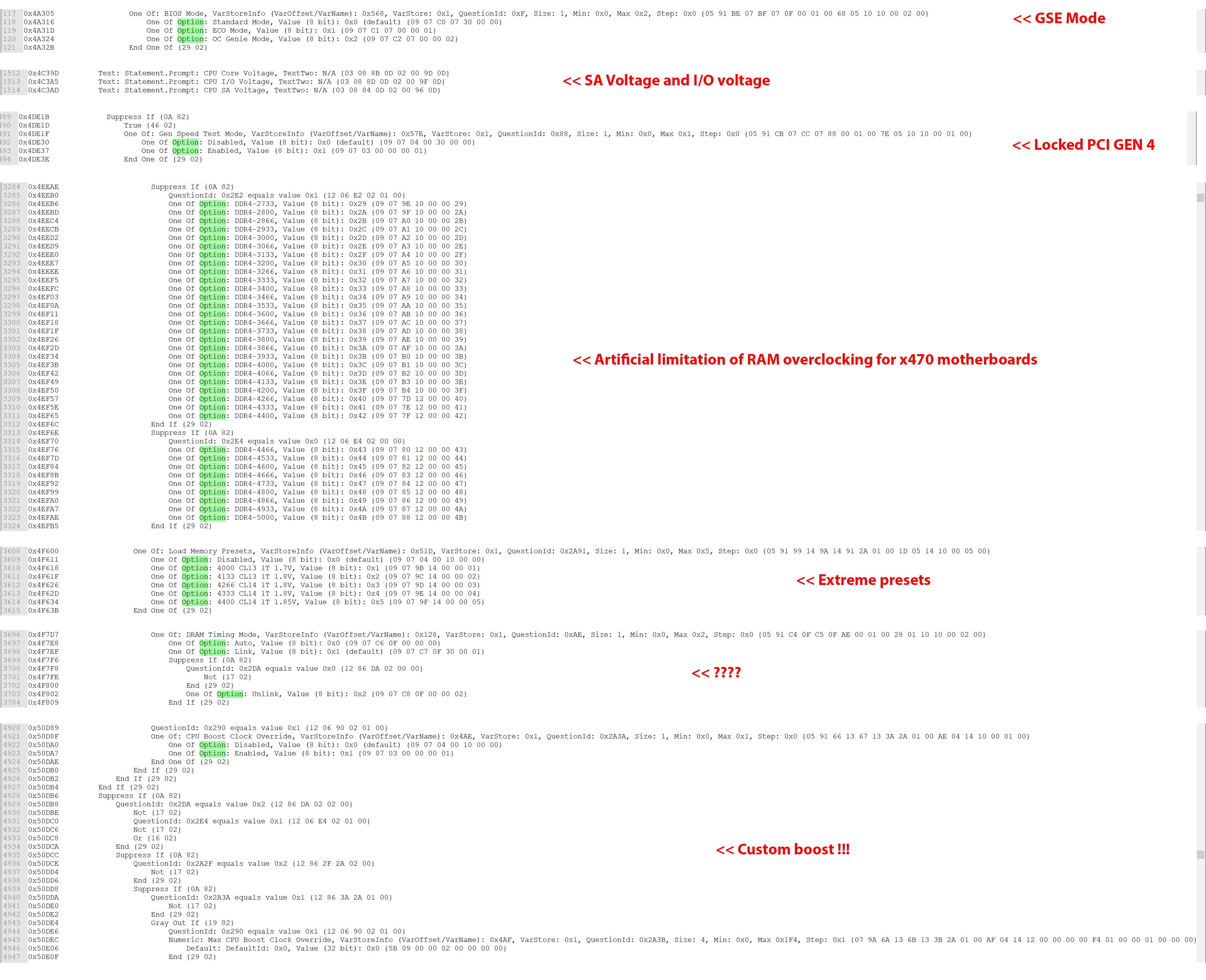 * искусственное ограничение разгона ОЗУ для х470 * залочен PCI Gen 4 * режим эко для биоса, без понятия что это такое * кастомный буст для ZEN 2 , руками настраиваем, это реально круто * модель питания I/О аналогична интелу, с системным агентом * экстрим пресеты для контуженных азотом