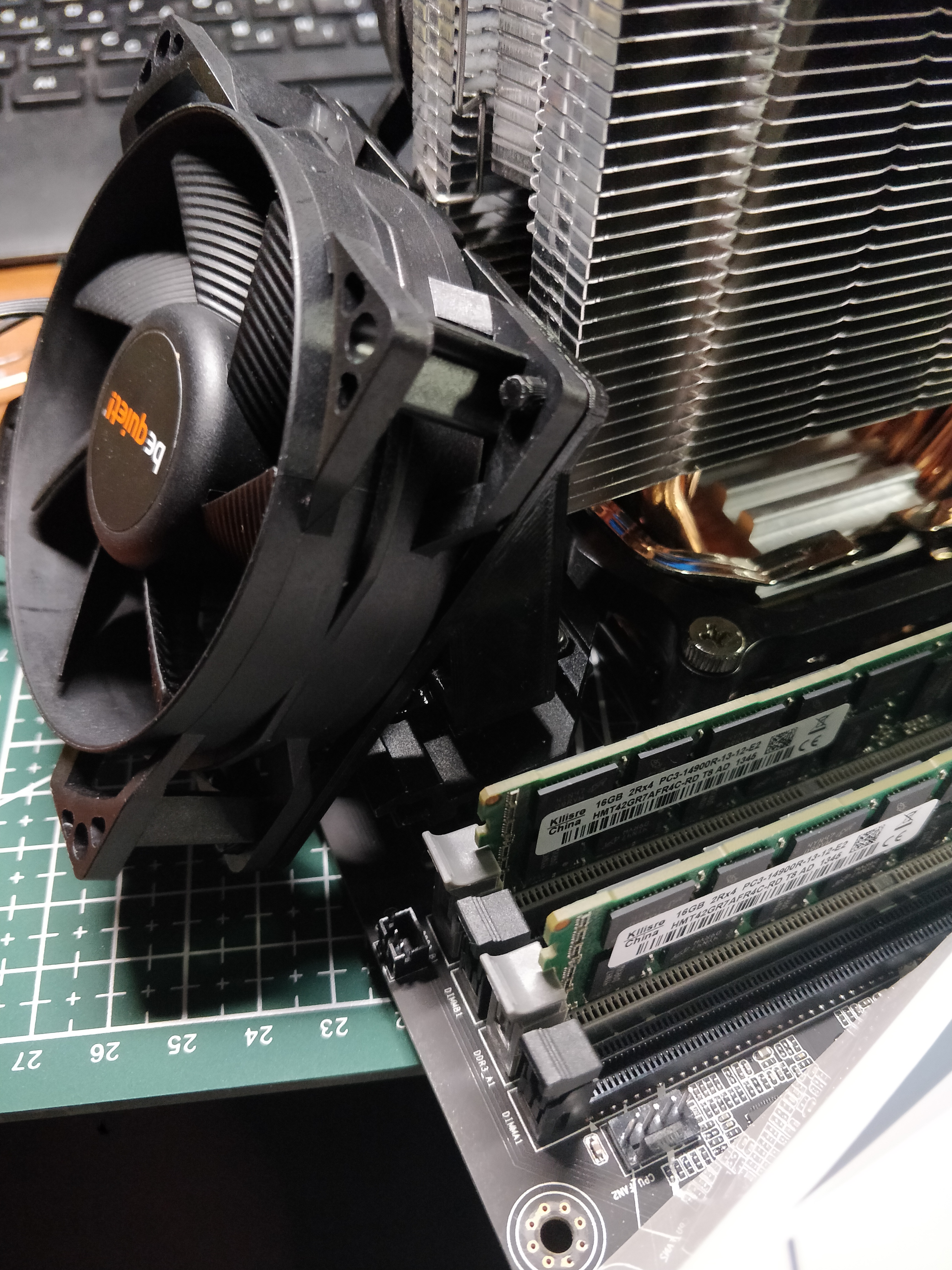 Немного напрягала организация охлаждения зоны VRM на X99-TF, поэтому решил переделать ее из подручных материалов, а именно использовать вентилятор 80х80. Соглашусь, что, наверное, это не самое оптимальное решение, т.к. в корпус (be quite pure base 500) можно было бы и верхний вентилятор поставить, но тогда его нужно было бы покупать, а так использовал имеющийся. В общем получился адаптер под установку одного 80*80 вместо двух штатных. Печатал на 3D принтере из PETG. Все вентиляторы (5 шт.) завел через кастомную плату с полевым транзистором на CPU_FAN для регулировки оборотов всех вентиляторов в корпусе.