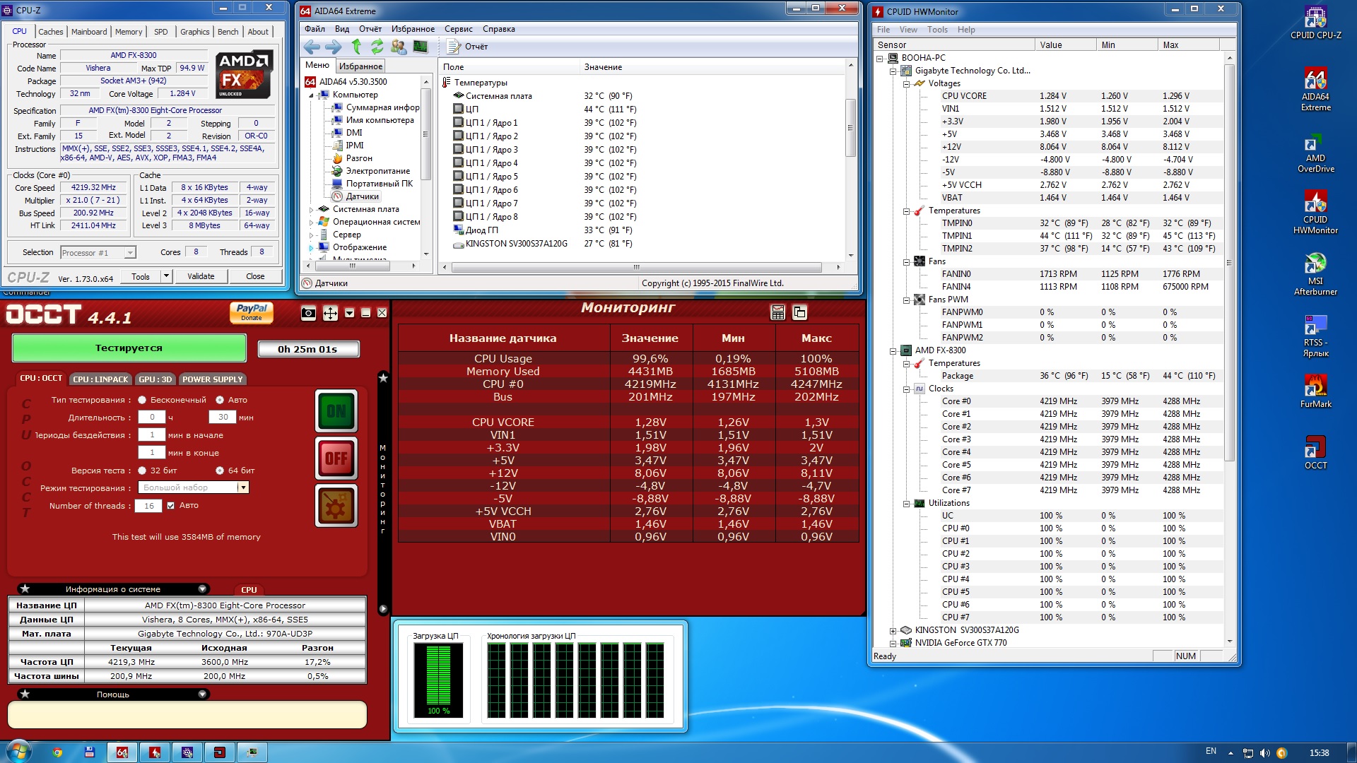 Я проверяю стабильность под LinX, а мониторю HWinfo. Ссылки на них есть в FAQ по FX'ам. Не знаю какие температуры показывает твой CPUID HWmonitor. У меня: