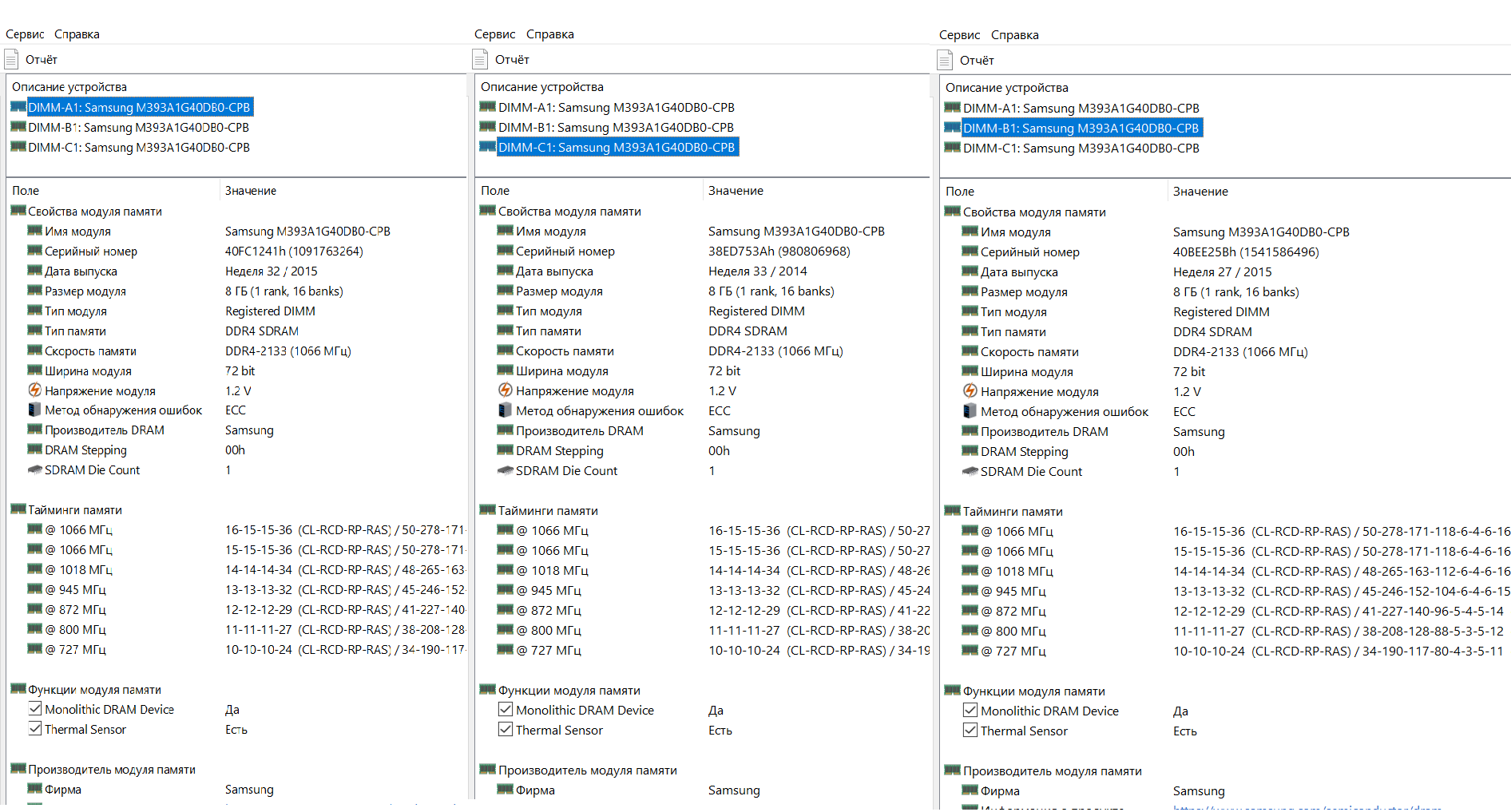 Вот это уже по делу. Теперь приложите скрины SPD каждого модуля памяти из AIDA64 или Thaiphoon Burner, чтобы было видно серийник.