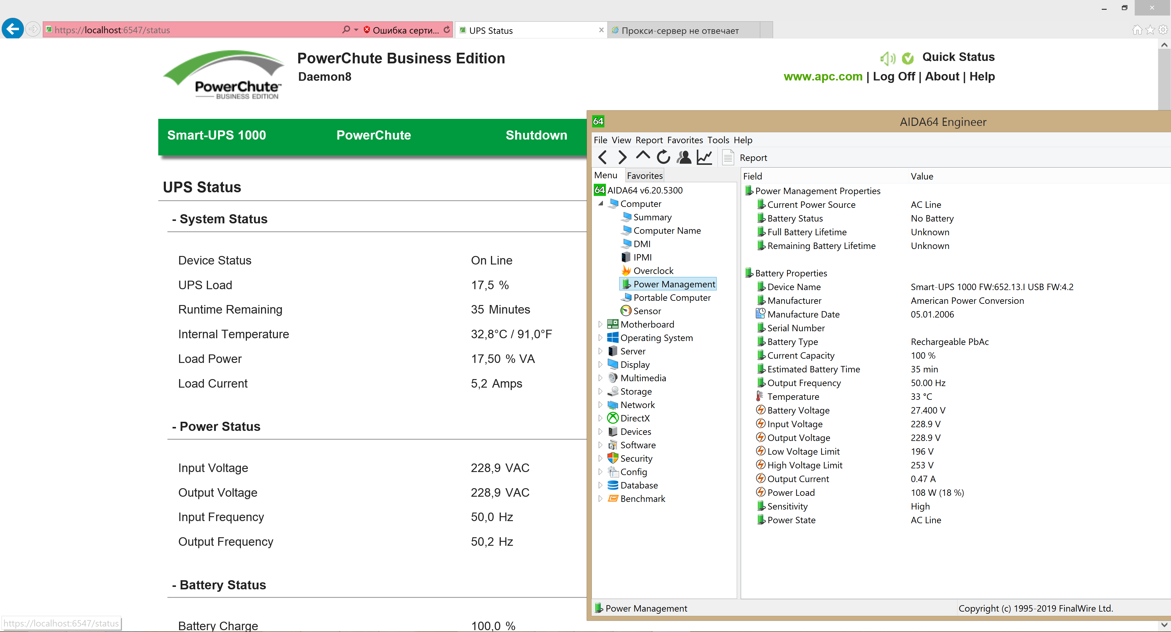 Ответ простой - да, это аида и да это требует наличия устройства. Дело в том, что аида тоже умеет собирать информацию с устройств которые определяются как HID-батарея, в частности ИБП APC. Более полная картинка для наглядности (Некоторые данные отличаются т.к. они меняются, а веб-страницу надо обновлять. Да и набор того что отображается разный.):