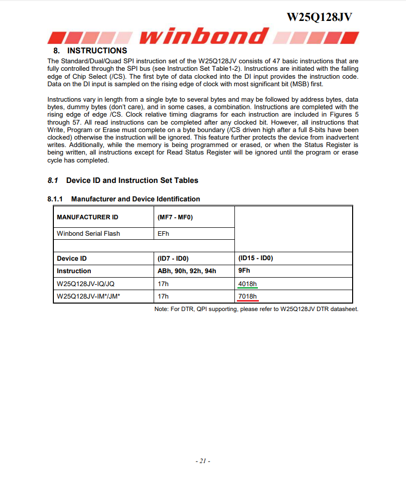 W25Q128JV / BV / FV имеют одинаковый идентификатор, алгоритм чтения и программирования флэш-памяти одинаков. Отличия только в организации Quad SPI