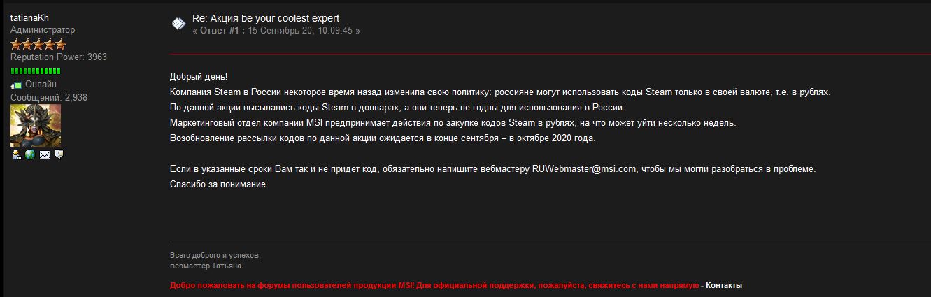 Для тех кто в танке, про акцию с кодами стим вебмастер отвечала в форуме MSI, обычно любой разумный человек покупая чью то технику заглядывает в их форум для поиска какой либо инфы, чаще всего там и пишут чтобы каждый раз по одному не отвечать. Если говорить про акцию, стим кинул на коды, и вопрос этот с ними решают, конкретно что случилось и как будут решать ниже показано. Кто успел получить код и активировать, тем повезло, кто опоздал придётся ждать, кинуть не кинут но ждать я так понял придётся долго, в чём приятного мало.