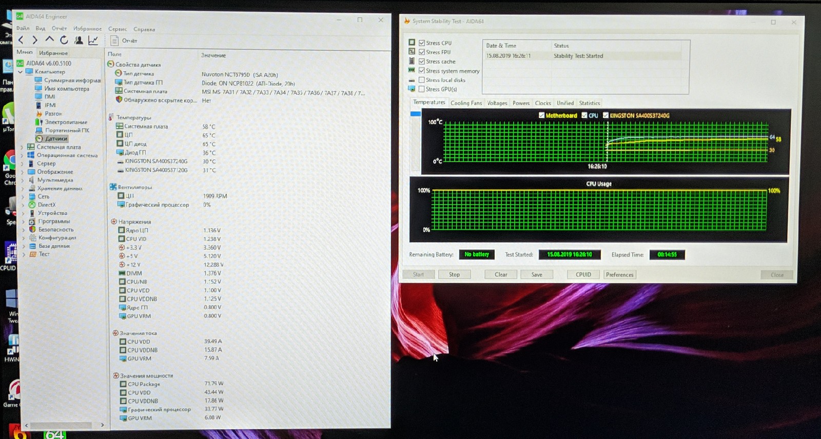 Всем привет, столкнулся с такой проблемой. Решил провести тест на стабильность в аиде64, выставил все галочки кроме теста ГПУ и Дисков. Ну и спустя 15 минут теста компьютер просто завис. Хочу подметить то что была разогнана оперативная память до 2933 Мгц, с помощью "Memory try it!" на материнке MSI, с таймингами 14-16-16. Убрал разгон оперативки, опять начал проводить тест, и опять завис, но через несколько секунд после зависания потух экран и все. Убрал галочку на stress FPU, 20 минут никаких проблем, завершил тест, поставил галочку только на stress FPU и на десятой минуте завис. Как я понял компьютер зависает на стресс тесте FPU. В играх, никаких проблем не замечал, что в ведьмаке 3 на ультрах, что в танчиках на ультрах, что в гта 5 на ультрах, играл и ничего не висло. А тут тебе на. Фотографию температур приложил (извиняюсь за качество), температуры вроде были в норме. Блок питания не самый плохой, chieftec proton bdf-600s. Жду ваших предположений, почему же он все таки виснет и что не так?