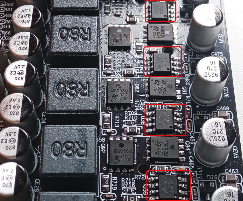 Эксперименты с платой x79z ver2.4F_C. При первом стресс тесте комп выключился через пару минут, после запуска. Был снят радиатор VRM. На фото видно, что микросхемы драйверов (uP1952P) значительно выше мосфетов. По отпечаткам на термопрокладке видно, что мосфеты почти не касаются термопрокладки, а вот драйверы продавили прокладку почти до металла радиатора. Я вырезал прямоугольные отверстия в прокладке в местах прилегания драйверов и снял прокладку с охлаждения дросселей (чтоб они меньше грели радиатор). Прикрутил доработанную конструкцию радиатора на материнку.