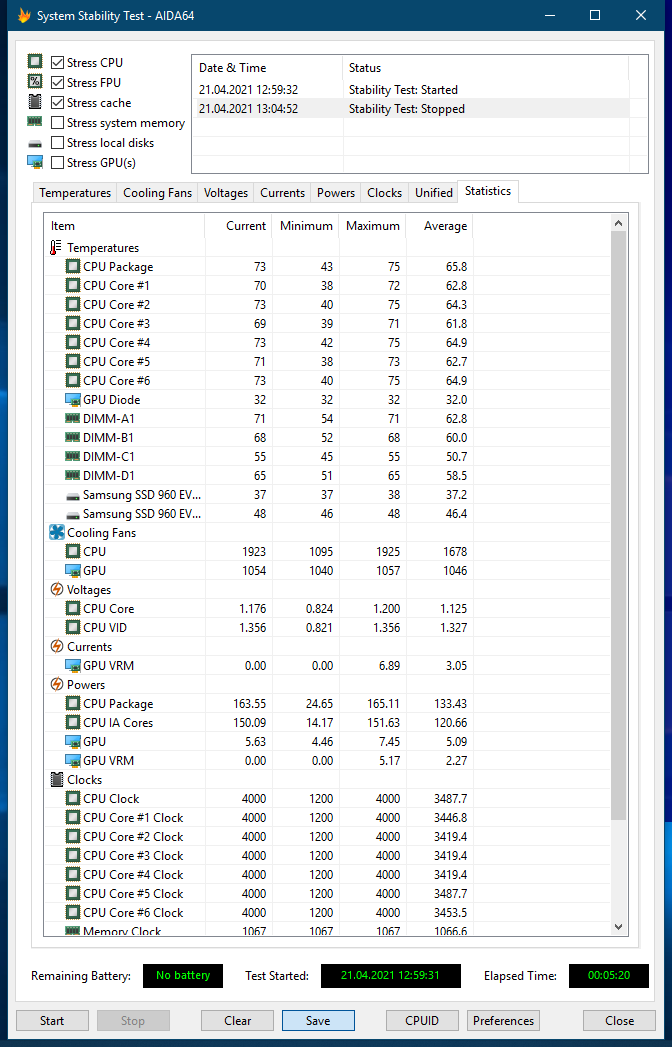 Теперь я могу запустить стресс тест в aida64 более чем на 5 минут
