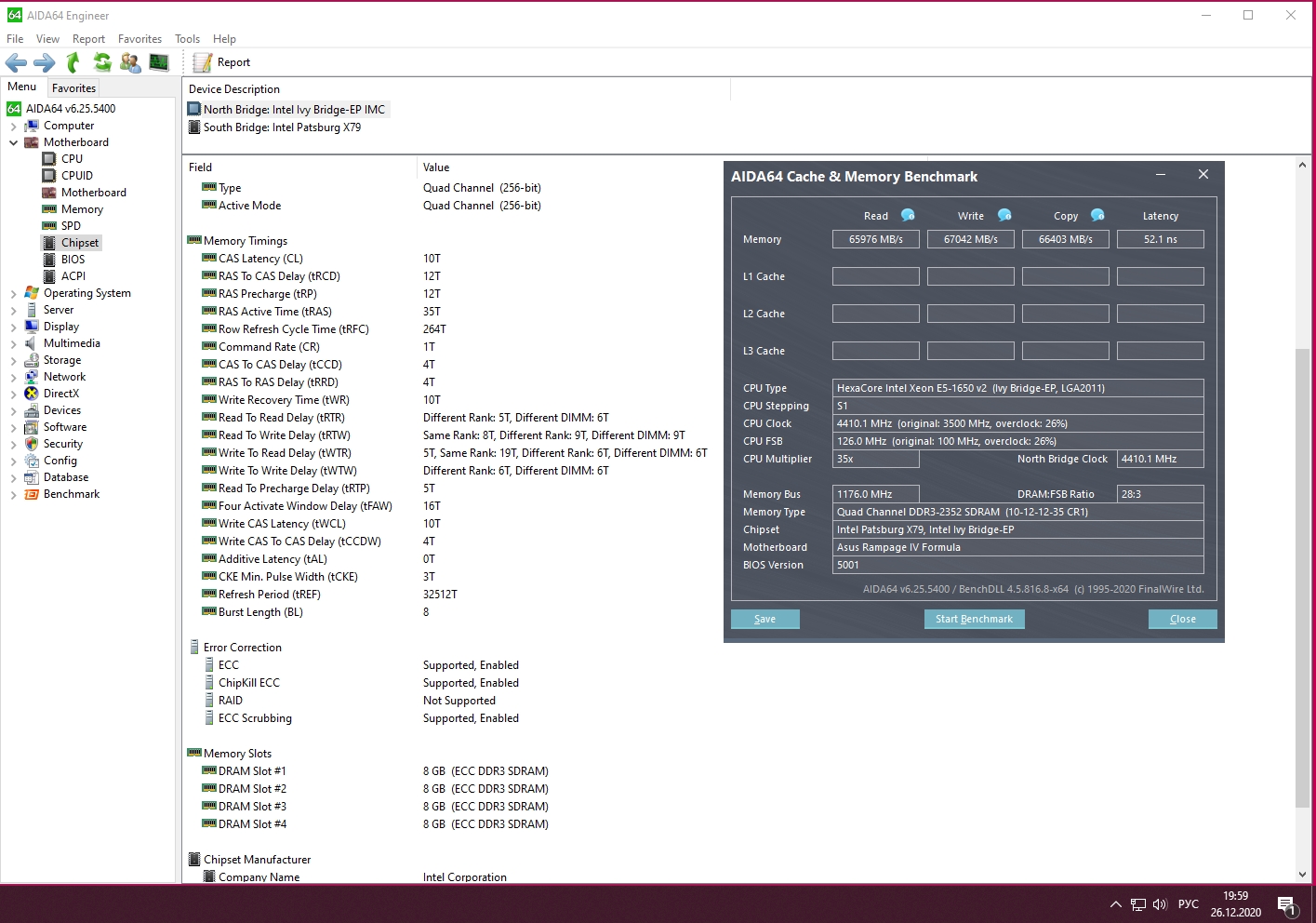 МП X79 turbo 1.03, CPU 2650 v2, память quad 4*4 Гб samsung hck0 1600 мгц, bios стоковый без возможности правки таймингов. Интересная особенность, в Aida64 в тесте памяти при частоте 1600 мгц показатели чтения, записи и копирования 47, 44, 45 Гб/с, как только ставлю частоту 1866 мгц, то 54, 33, 50 Гб/с, то есть копирование сразу проседает на 11 Гб/с. Это связано со стоковым bios просто?