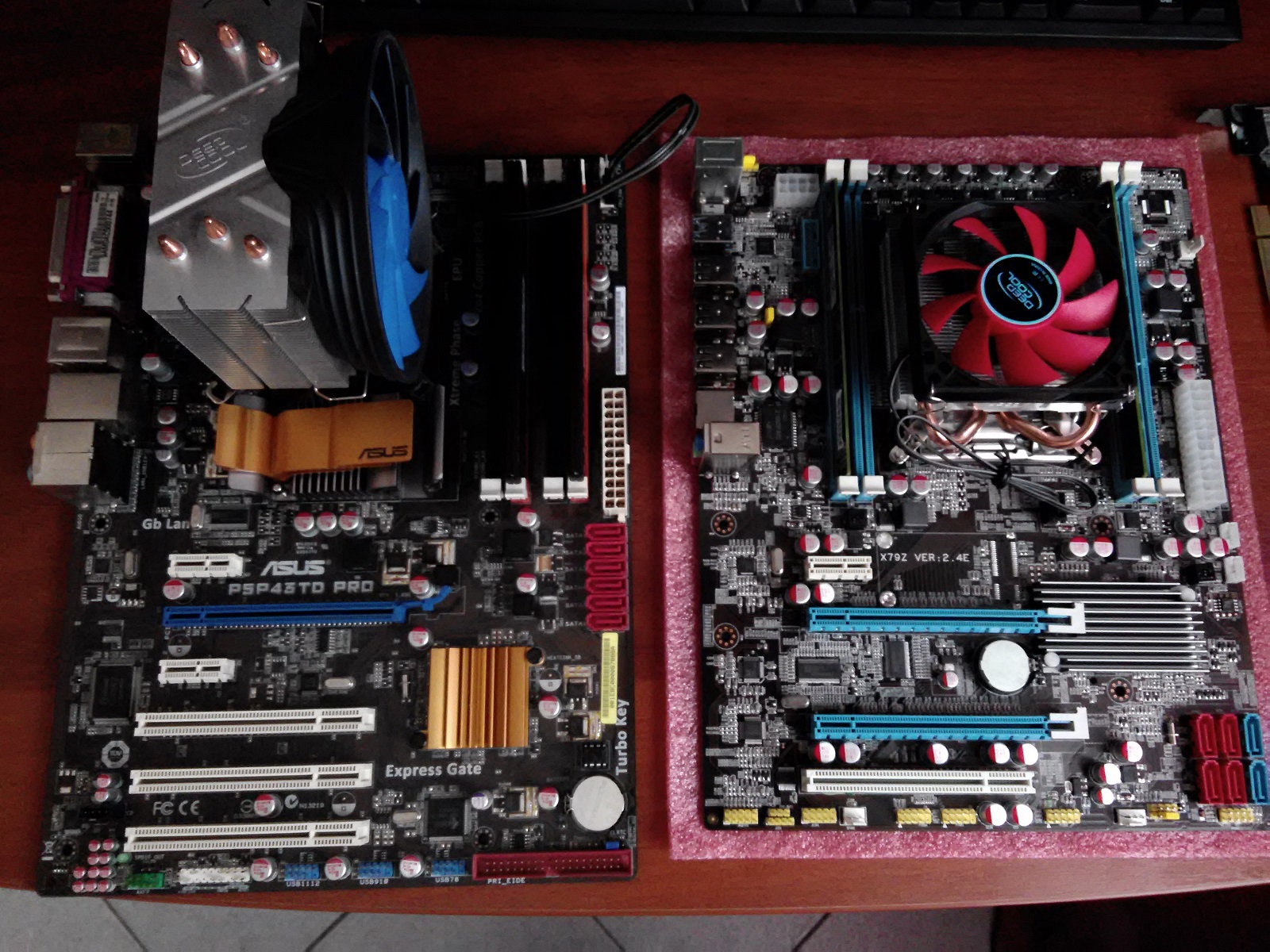 Наконец, окончательно переехал на 2.4Е. У меня вариант без радиатора. Купил мелкие, приклеил. Воткнул 4+4 (1600) и 2+2 (1333) модуля обычной старой DDR3. Из коробки биос позволял гнать память. Выставил 1600 и забыл. Пасту на мосту сменил: радиатор при этом сидел криво из-за кривой мягкой прокладки. Подрезал, перемазал - готово. Работает как часы. Самый горячий элемент, не считая ПЕЧ970, - мост (С602-й). Палец при этом держать можно. Остальное просто теплое, даже после пары часов в игры. Стресс-тесты гонять смысла не вижу - не для этого покупал. После эпичного E5450 не скажу, что "вау", но в целом бодрее. Винда 7 нарисовала 7.8 процессору. Остальное по 7.9 попугая. Процессор прогревается в тяжелых приложениях до 55-58 градусов. Частота в среднем 3 ГГц с максимальным турбобустом 3.4. Короче, плата хоть на вид простенькая, но без особых косяков.