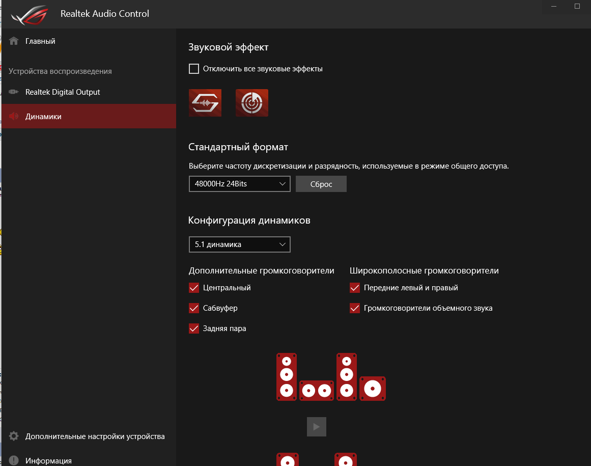 Подскажите как исправить ситуацию со звуком, не работает саб и центральный динамик, материнка asus rog strix x570-e gaming, акустика 5.1. В системе 5.1 включён, в драйверах тоже включен, но если зайти в свйоства динамиков, то отсутствует кнопка баланс напротив Center и Subwoofer, провода не путал, всё подключено правильно, раз 100 перепроверил, при этом когда делаешь тест акустики, то центральная издаёт звук, а саб еле еле слышно