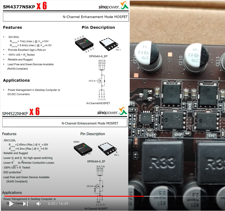 v111, если стоят оригинальные транзисторы Sinopower SM4377 и SM4522, что в видео, то они на голову выше тех QM3092 и QM3098, что стояли в первых ревизиях F8 и TF. Другое дело, что в нижнем плече всё же по одному транзистору на фазу, а не по 2. Так что VRM с пассивным охлаждением должен нормально работать на 120 Вт нагрузки. Но всё же обратите внимание, что между транзисторами установлены высокие керамические чип-конденсаторы. И, судя по всему, высота этих конденсаторов выше транзисторов. Так что настоятельно рекомендую высверлить в радиаторе или доработать надфилем выборки под эти конденсаторы.
