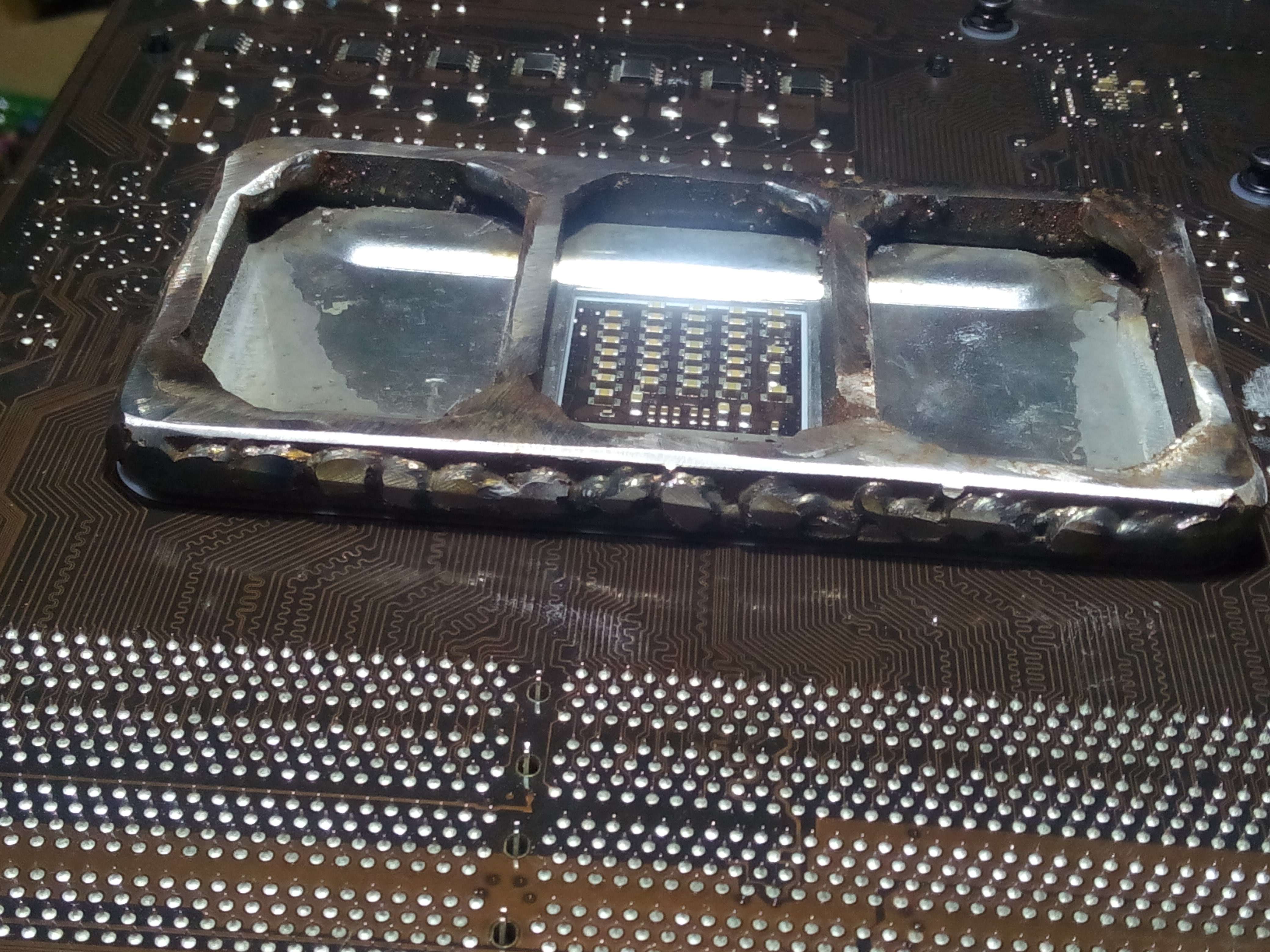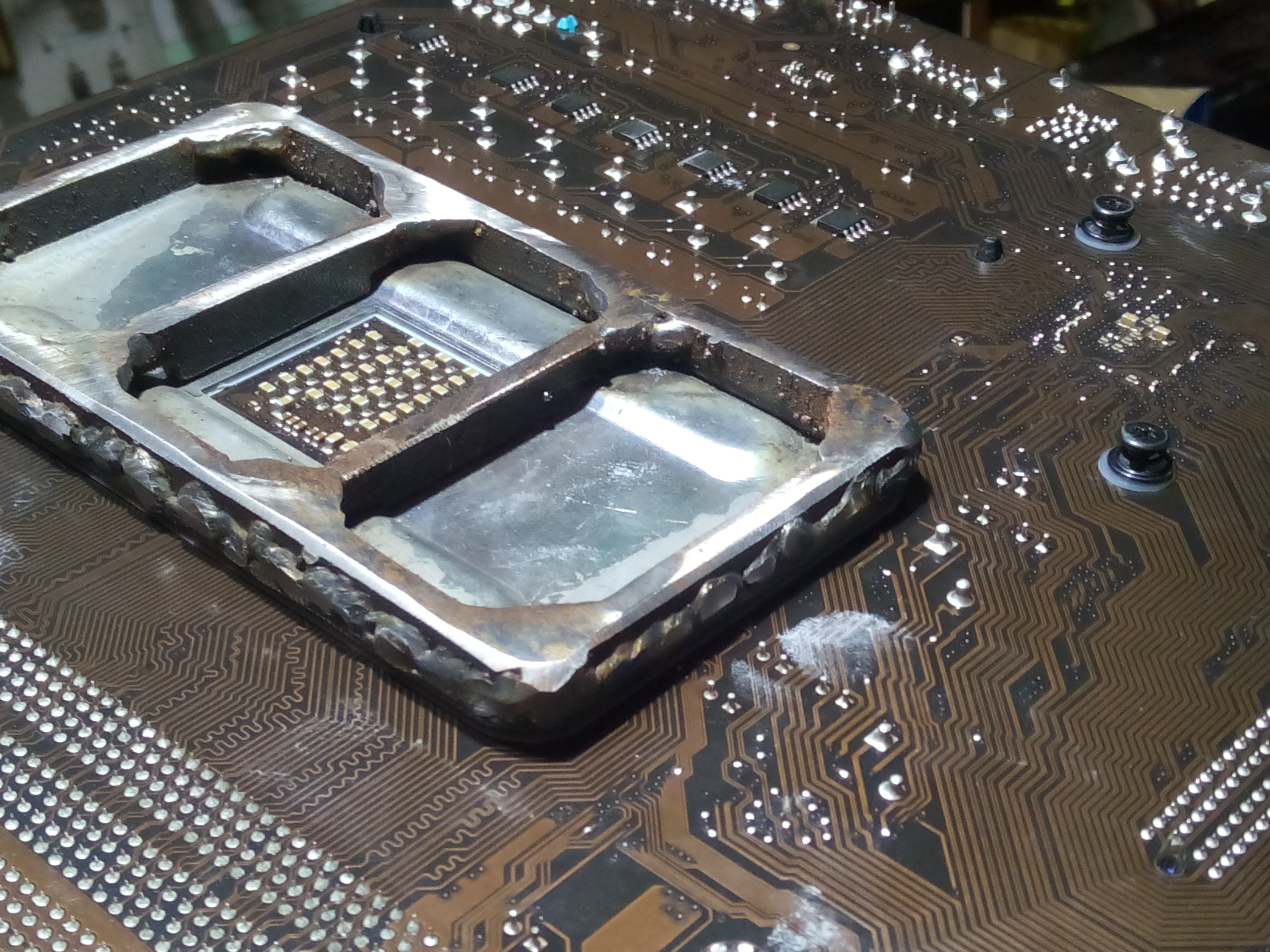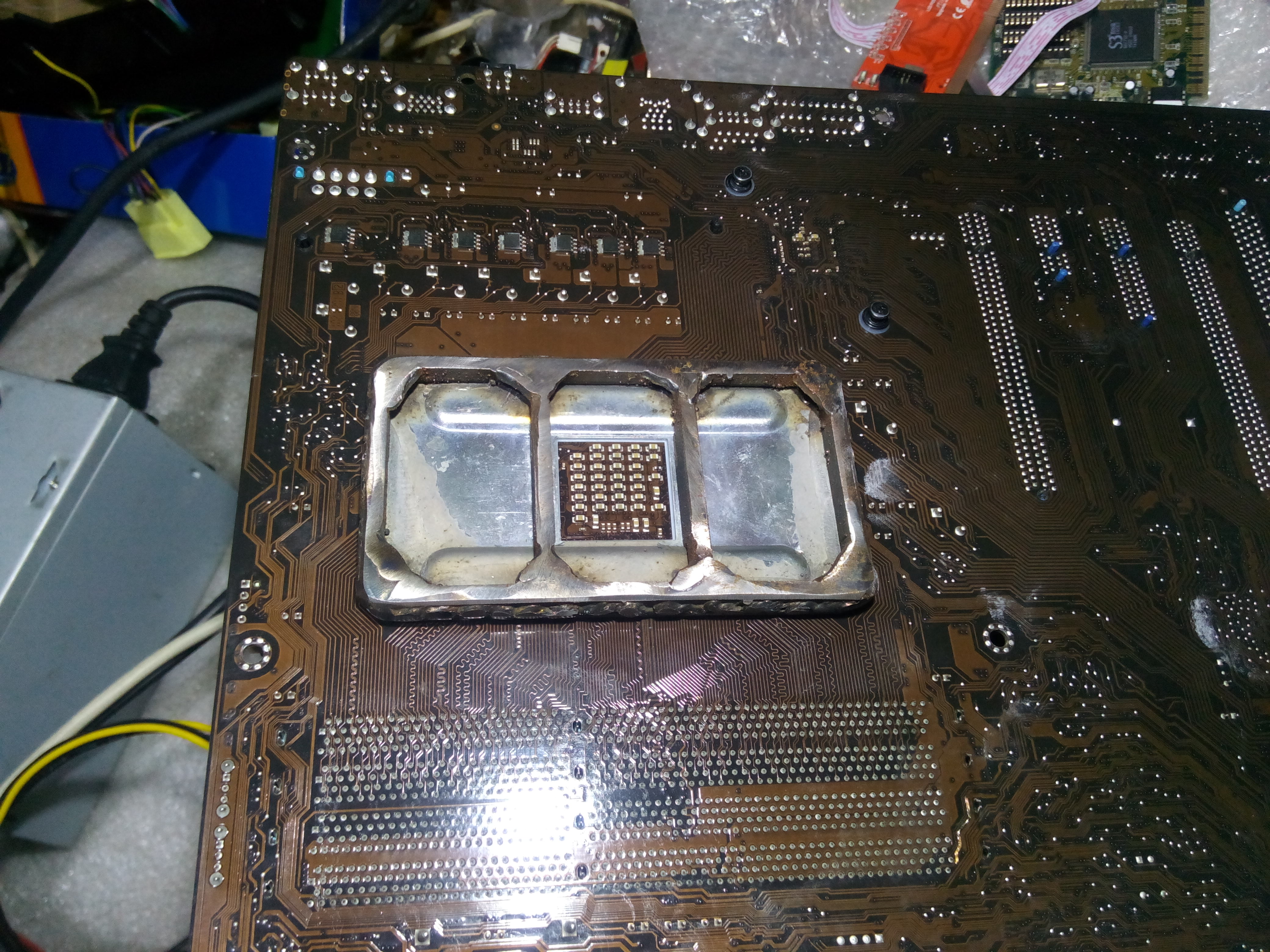 Добрый день! Купил бу материнку Asus M4A89TD PRO и сразу же начались проблемы с памятью описанные ребятами раньше ,материнка глючила когда ей вздумается. Перечитал весь форум и пришел к выводу - отвал сокета. Глянул на материнку сбоку,а там даже железная планка с ребрами жесткости под сокетом сильно сильно изогнута почти под яйцо .Это у Asusа брак , да и бывший хозяин любил кулер затягивать до усерачки . Из положения вышел следующим образом - ставить виравненную планку смысла не ,станет такойже .Пришлось болгаркой из 5 милиметрового железа нарезать железа для ребер жесткости и полуавтоматом сварить и подогнать вот такую конструкцию,уже почти месяц проблем нет . Может кому пригодиться.