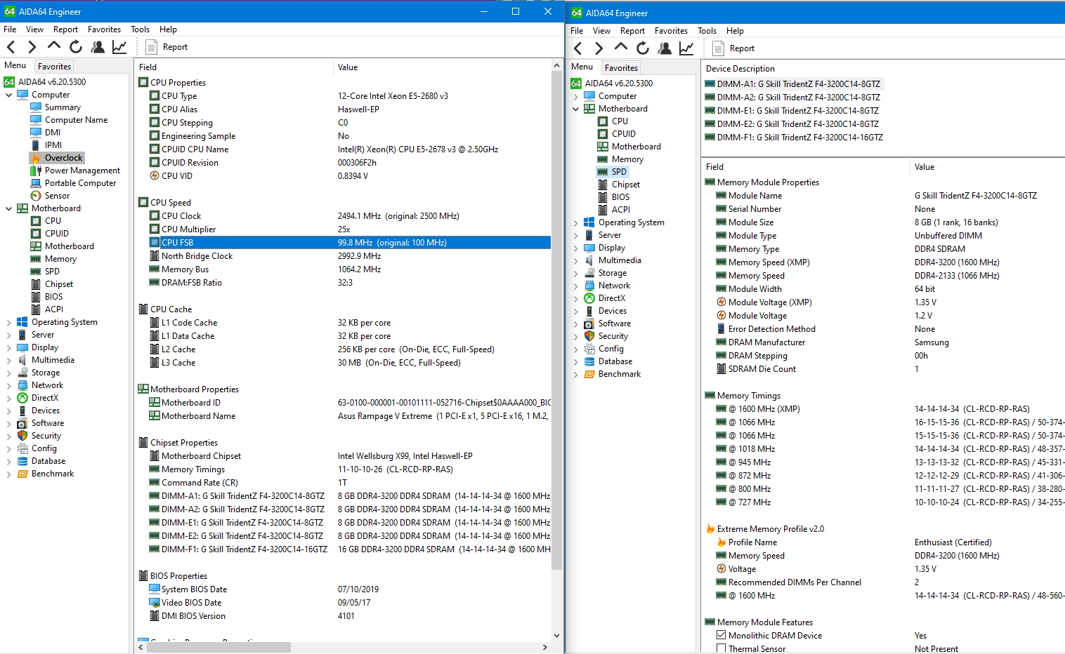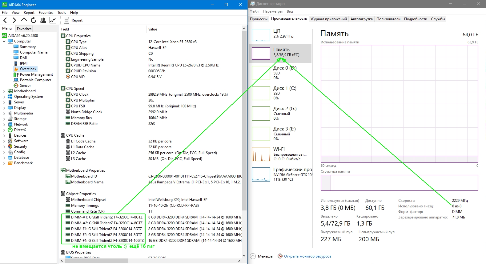 Всем доброго времени суток. Столкнулся с непонятной ситуацией и прошу вашего совета. Сборка r5e10, 6950x,16gb x 2 g.skill tridentz gtzr 3200 14-14-14-34, sams 960pro, noctua nh d15, 6x NF-A14 iPPC 3000pwm, corsair ax1200i, 1070 strix. До этого стоял 6800k и 8gb x 4 hyperx hx428c14. После замены железок задержка памяти упала до 59, но появились( вроде на 6800 не было) микрофризы при серфе папок и интернета. В играх такой проблемы не выявил, кроме пубга. Ось переставлялась несколько раз. Настройки биоса менялись во всех плоскостях, в том числе и в дефолте. Может ли эта ситуация связана с двумя плашками памяти? И остался еще один вопрос, выше 3200 память не хочет запускаться. Возможно ли gskill разогнать на r5e10 хотя бы до 3400 или может выше?