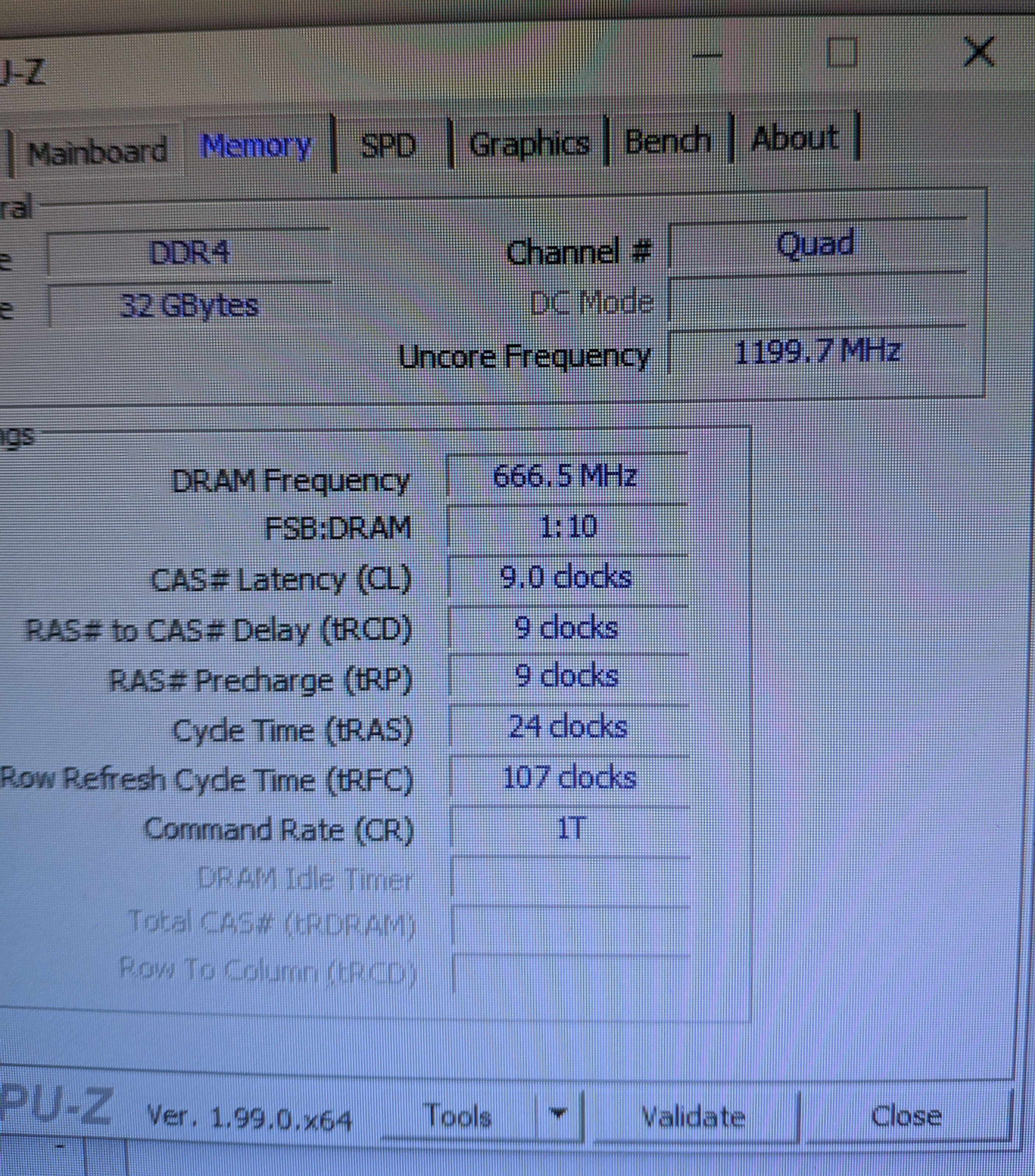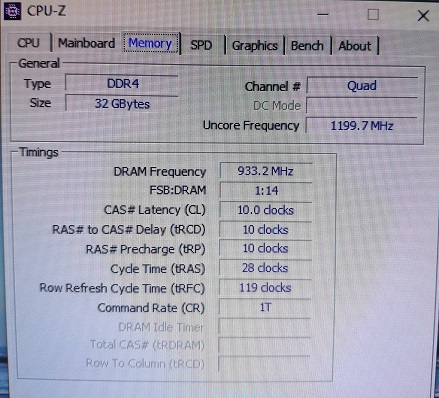 Параметры ОЗУ показывают Uncore Frequency :1199.7 MHz DRAM Frequency :666.5 MHz FSB:DRAM :1:10 CAS# Latency (CL) : 9.0 clocks RAS# to CAS# Delay (tRCD) : 9 clocks RAS#Precharge (tRP) : 9 clocks Cyde Time (tRAS) : 24 clocks Row Refresh Cyde Time (tRFC): 107 clocks Command Rate (CR) : 1T