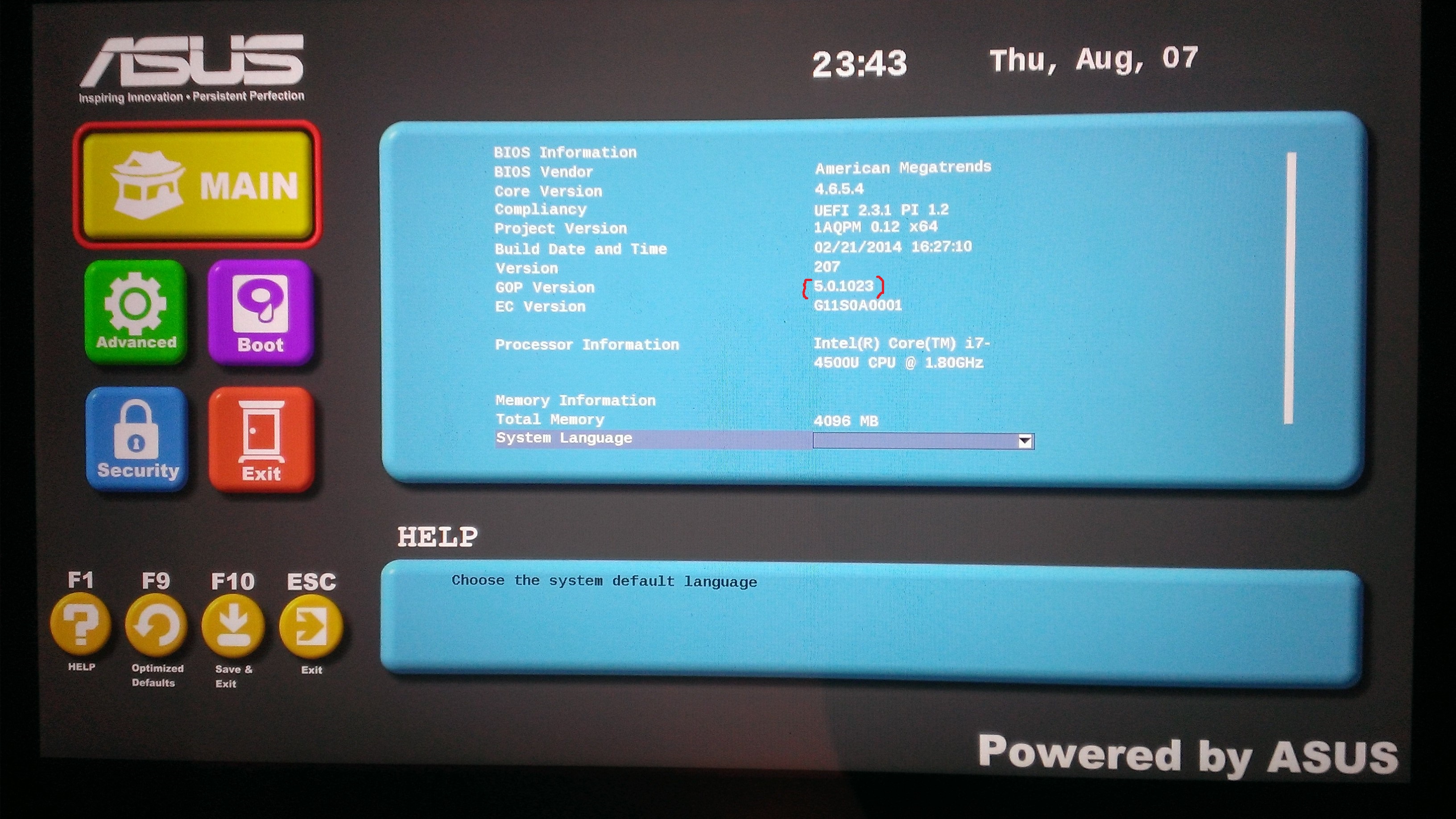 LS_29, Приветствую вас! Я тот знакомый товарища Klem, на чьём планшете-трансформере Asus T300LA проводим эксперименты и исследования с GOP. Отвечу на ваш вопрос по поводу: как на новых GOP в Биос не заходит? Рассказываю, например я хочу войти в Биос из под винды - через изменение параметров компьютера и далее по пунктам, планшет когда начинает перезагружаться, получается просто чёрный экран и всё вентилятор при этом крутится, но экран просто чёрный даже подсветка не просматривается. Также происходит если из полностью выключенного состояния попробовать войти в Биос с помощью кнопок на планшете, одновременно зажав качельку уменьшения громкости и кнопку Power, планшет по идеи включается, потому что вентилятор начинает крутится, но экран также остаётся полностью чёрный, как у выключенного, а если планшет просто потом выключить долгим удержанием кнопки Power и потом его просто включить нажав на эту же кнопку, то винда грузится в режиме легаси, т.к. при старте заставки с надписью Asus нет, есть только заставка со значком Windows, но экран включается и всё показывает, как и должно быть. с GOP 1023 также всё отлично работает, как и с GOP 1034, в Биос войти могу, винда сразу после перепрошивки грузится в режиме UEFI, я это сразу понимаю после прошивки мода по заставке со значком - эмблемой Asus при загрузке винды (сразу после включения планшета кнопкой), когда винда грузится в режиме легаси, то этой заставки с эмблемой Asus при загрузки винды нет, там сразу появляется заставка с эмблемой Windows.