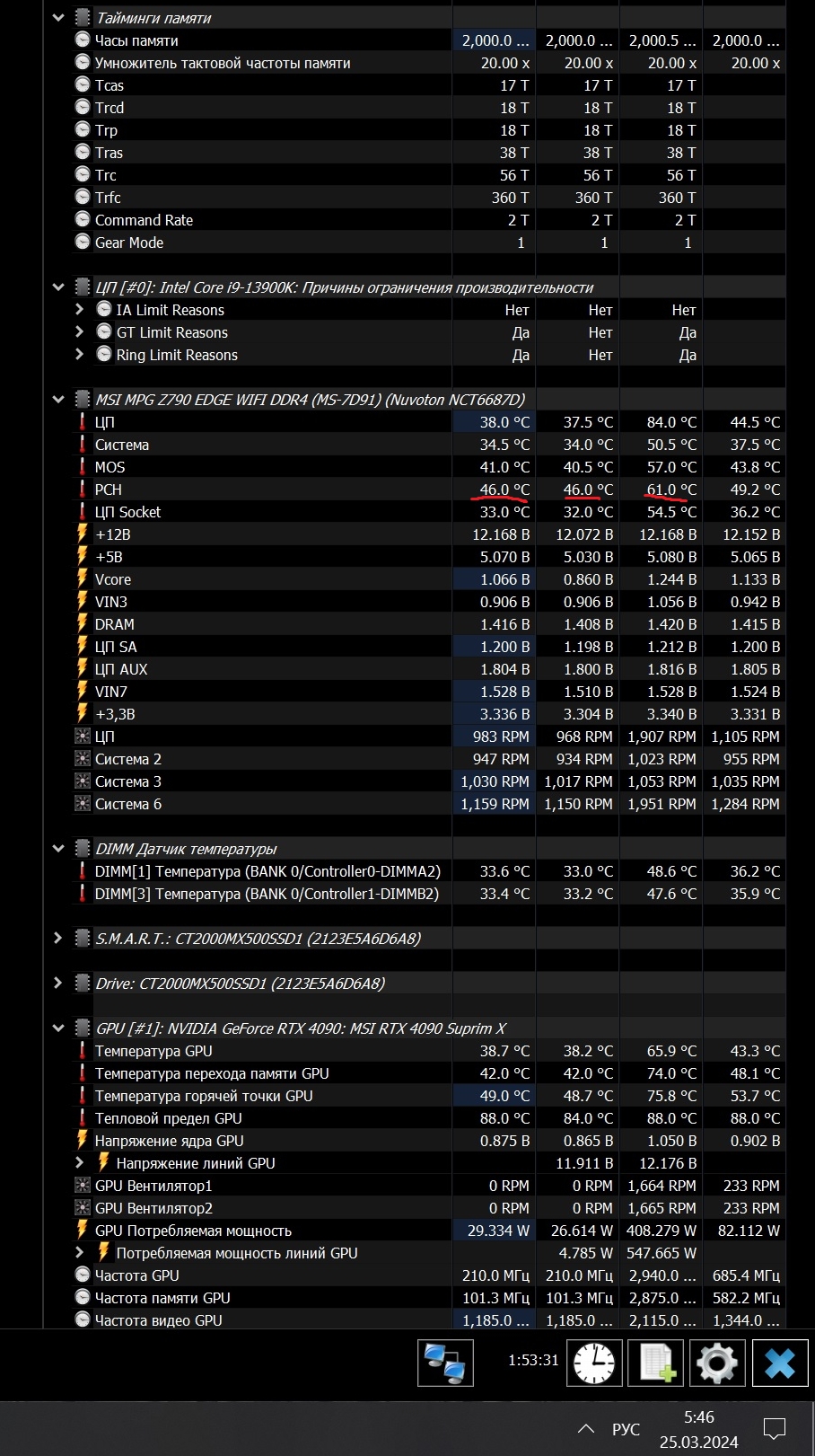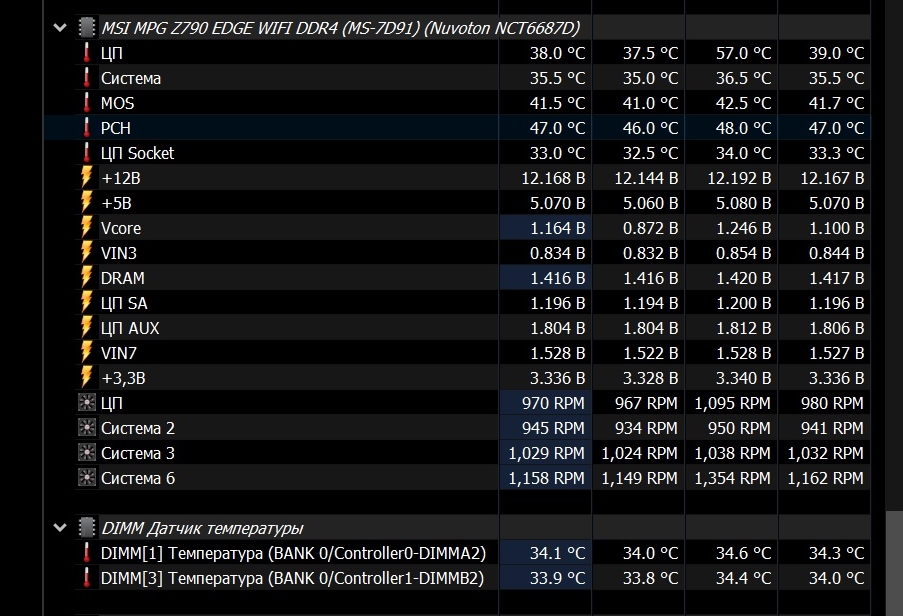 z690 msi tomahawk DDR4 с 2021 года. Биос самый первый, не обновлял ни разу. Стоит 4 nvme, из которых три - pcie4 и один - pcie3. Темпа PCH - 50-60 градусов. С каждым новым добавленным nvme темпа эта росла, когда их было 3 - максимум что видел это 55 градусов в любом сценарии. Щас вот, после добавления последнего м2 стало до 60 градусов. Термопрокладку не менял. Подскажите пожалуйста, что за напруги "ЦП AUX" и "Vin7" и нормальное ли у них напряжение? https://ibb.co/cwv97nH