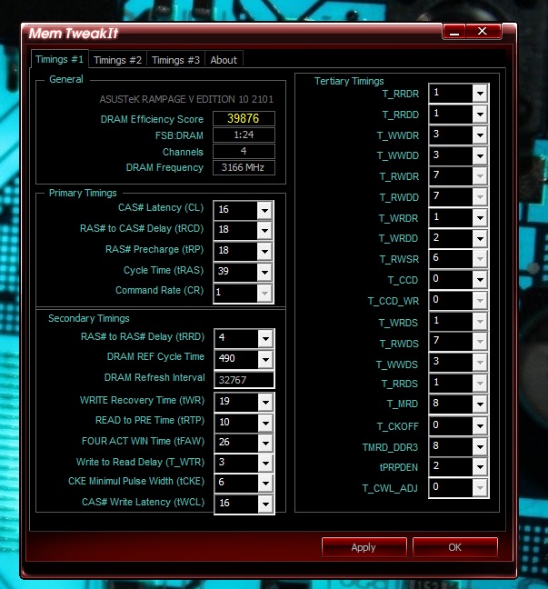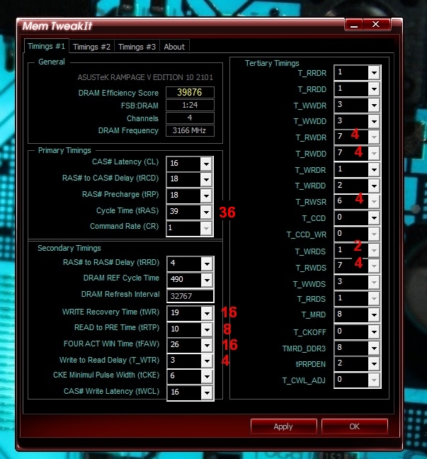 ты сам заявил 14, потому и упомянуто было 14 +делай в моём формате↑ картинку ака аида+асрок, + мог бы из биоса скинуть картинки. А пока такое↓ + такое https://yadi.sk/i/NMsx4m5xUAUdzQ + https://yadi.sk/i/gwBK3jku-bw4mA по третичкам. tCCD_L у тебя может заработать и 2 и 1 ибо у тебя хоть и микроны, но одноранги(DRAM Clk потом можно уменьшать до 4, а пока авто).