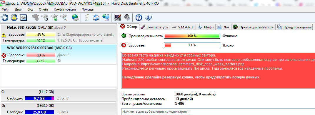 вот что единственное это SMART. до недавнего времени всегда включал SMART от парочки разных программ и удивлялся что мой HDD WesternDigital имеет хороший смарт и здоровье. даже когда глюки с юсб были тоже было 100% здоровье. сейчас включаю и вижу вот это: см.скриншот. я в шоке.. что делать?