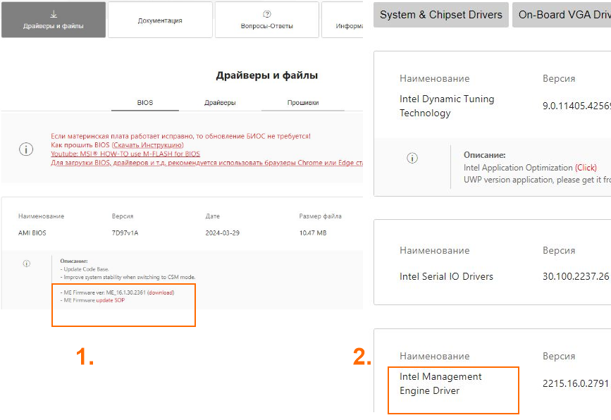 Всем привет, как надо обновлять me? я обновил биос, было все норм, затем запустил обновление me(на скрине первый файл), неделю назад оно вообще не вставало, в этот раз поставил драйвер на чипсет(ранее только винду ставил без дров) и попробовал накатить me, после перезагрузки словил bsod-ы с ошибкой 0x0000098 пробовал фиксить проверкой диска, восстанавливать через образ никак, пришлось переустановить систему. На сайте msi 2 файла me - один идет с биосом(там отдельно скачивается файл 2мб), другой в разделе драйверов и весит почти 300мб(см скрин). Причем на оф ютуб канале устанавливается только второй https://youtu.be/hWpCm4o6K3c но видео 4 года и тогда с биосом ме не шел. Их в каком-то порядке надо ставить и надо ли вообще? Плата b660 mortar max wifi ddr4