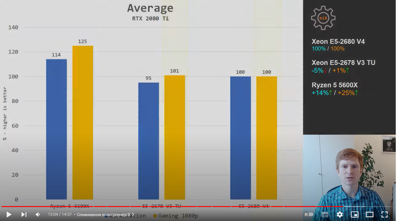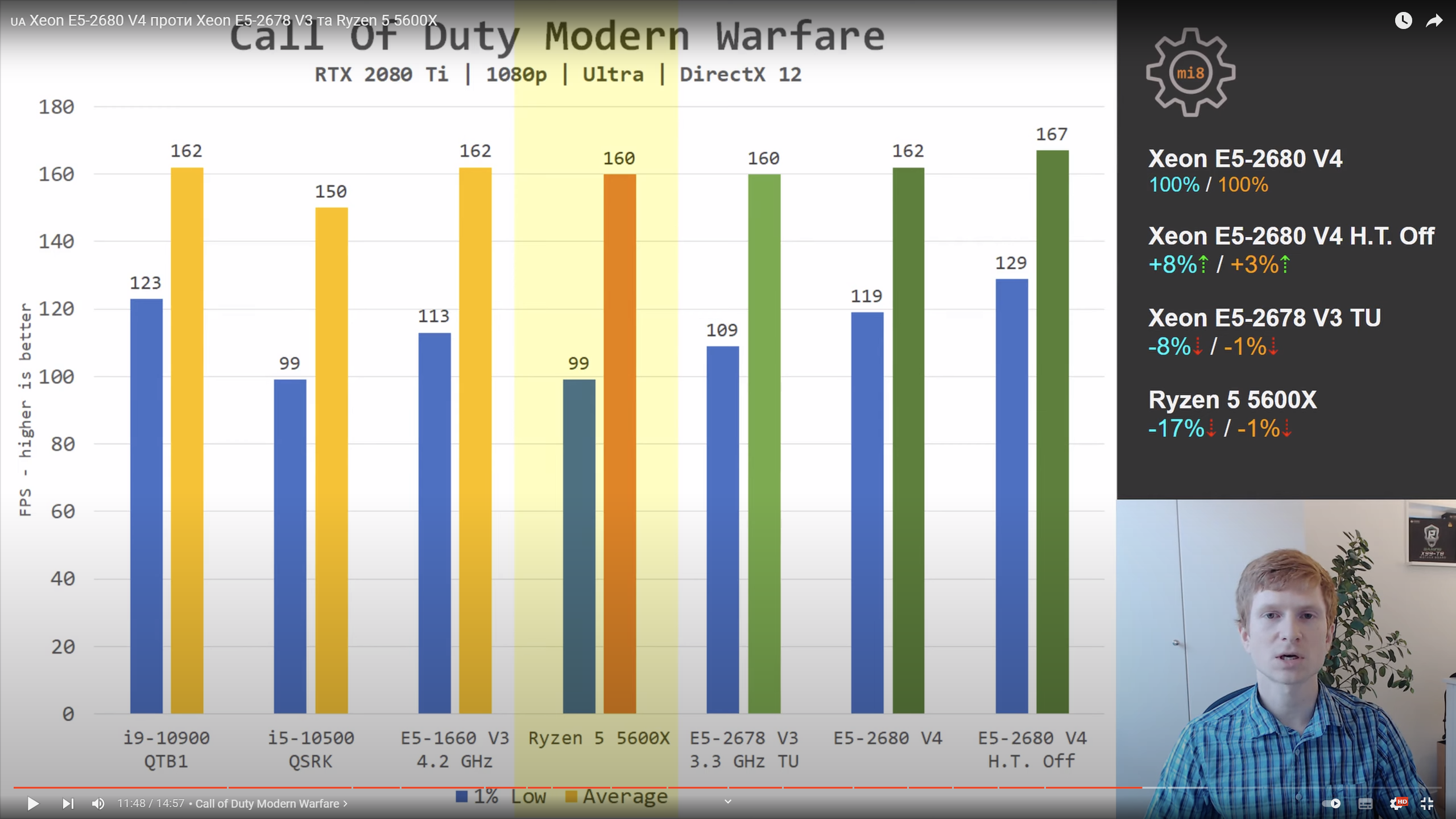 Посмотрите на минимальный ФПС. А если 2680v4 разогнать на нормальной плате и тайминги ужать, то результаты были бы ещё лучше. Источник: https://www.youtube.com/watch?v=gdsg0u2YnU0