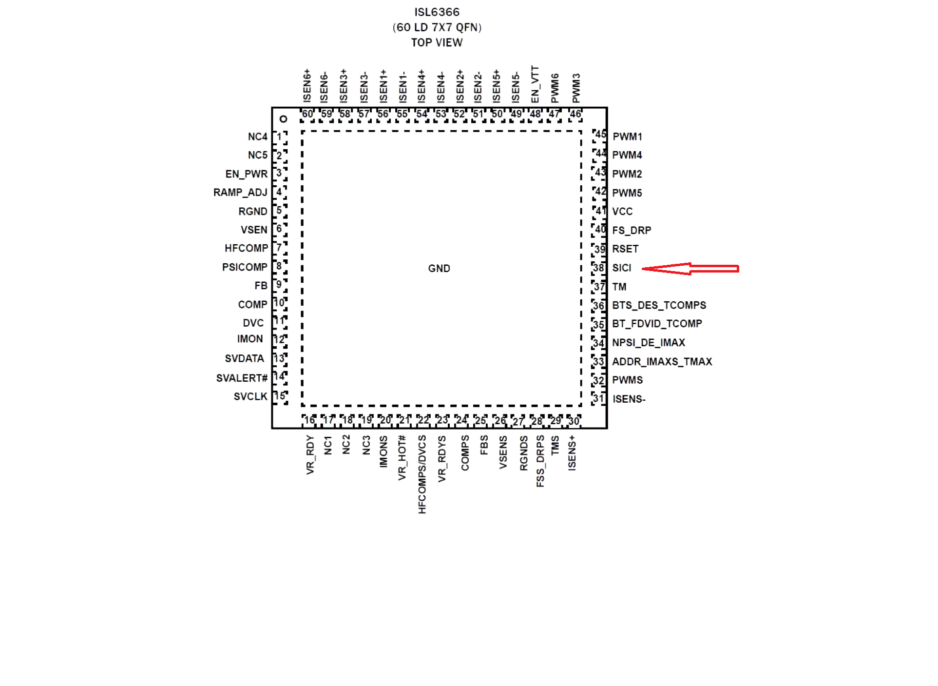 Материнская плата: Huanan x79 Gaming Deluxe, ШИМ-контроллер стоит: ISL6367CRZ. Посмотрел по даташит ШИМ-контроллера ISL6366 и дополнительно методом прозвонки мультиметром определил, что резистор стоит на 38 выводе SICI.