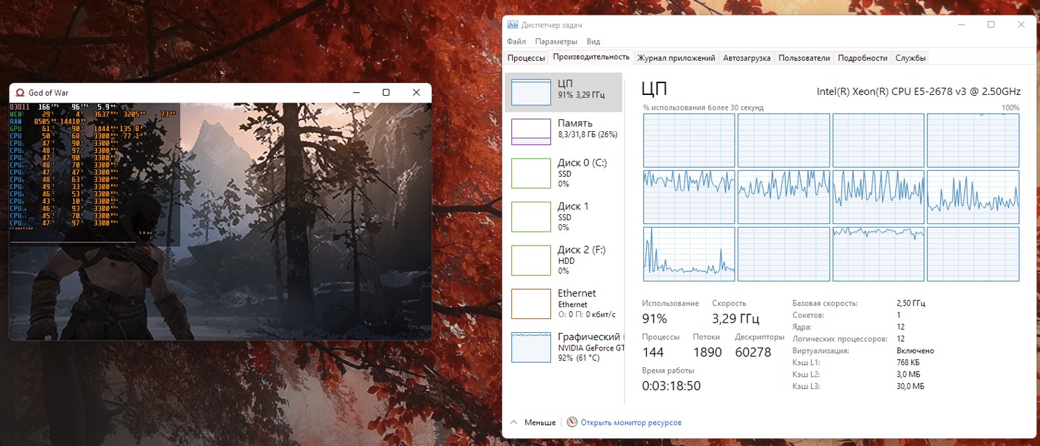 Кому интересно тест проца в GOD OF WAR xeon 2678v3 gtx 970 Минималки, разрешение 640х360, масштабирование 50%.(только так удалось упереться в проц) фпс около 170. Как видно игра юзает полностью 6 ядер и на остальные 6 раскидывает неравномерно. Загрузка проца 90% без HT. GTX 970 выдает 45 кадров на средних fullhd.