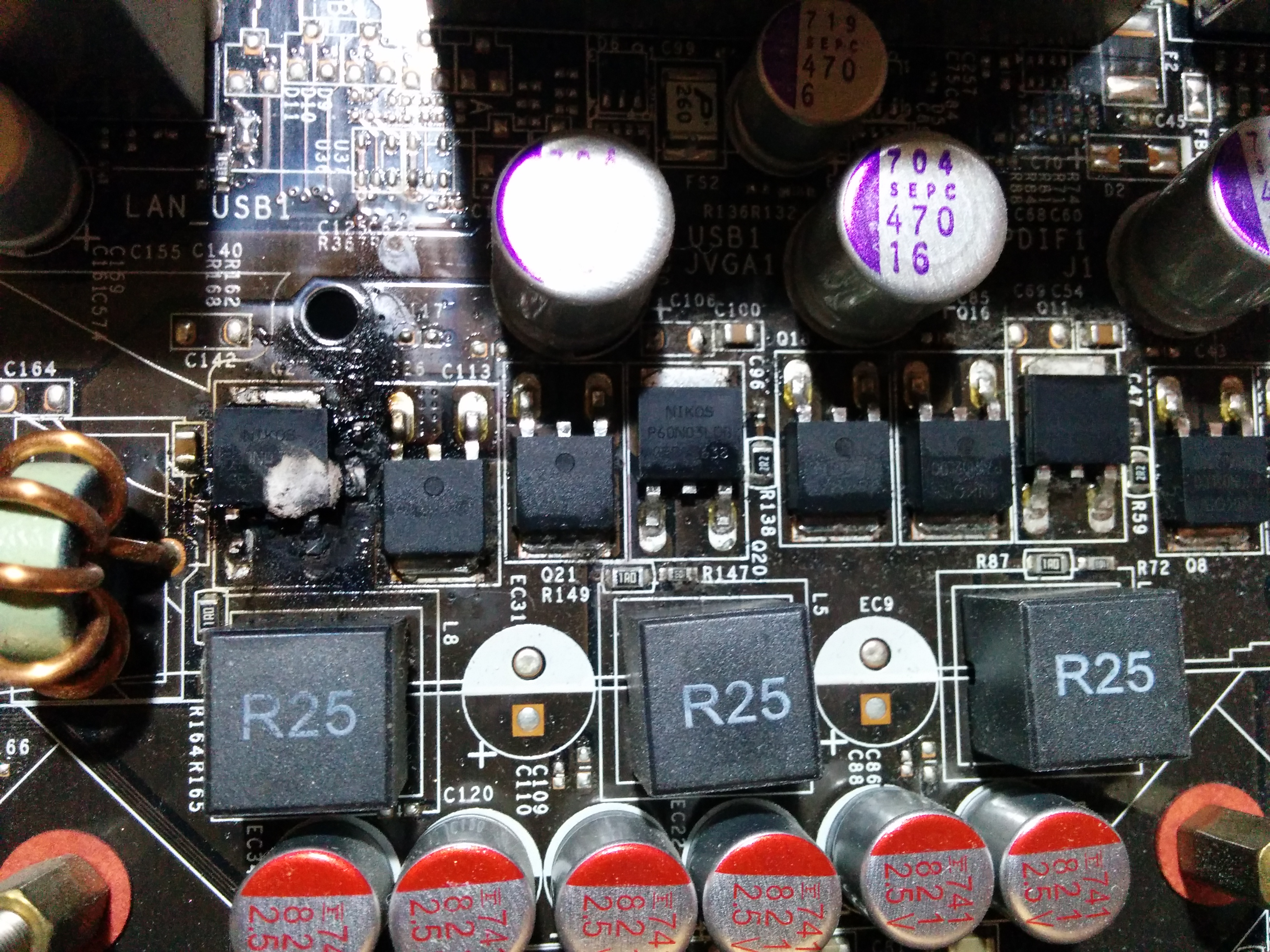Вчера полыхнула мать. У кого-нибудь была такая же проблема? Почему выгорает транзистор, может ли быть причиной БП? Есть ли вероятность того, что прогорели дорожки и еще какие-нибудь элементы? Из-за e5450 не могло такое случиться, хотя я ничего не разгонял?