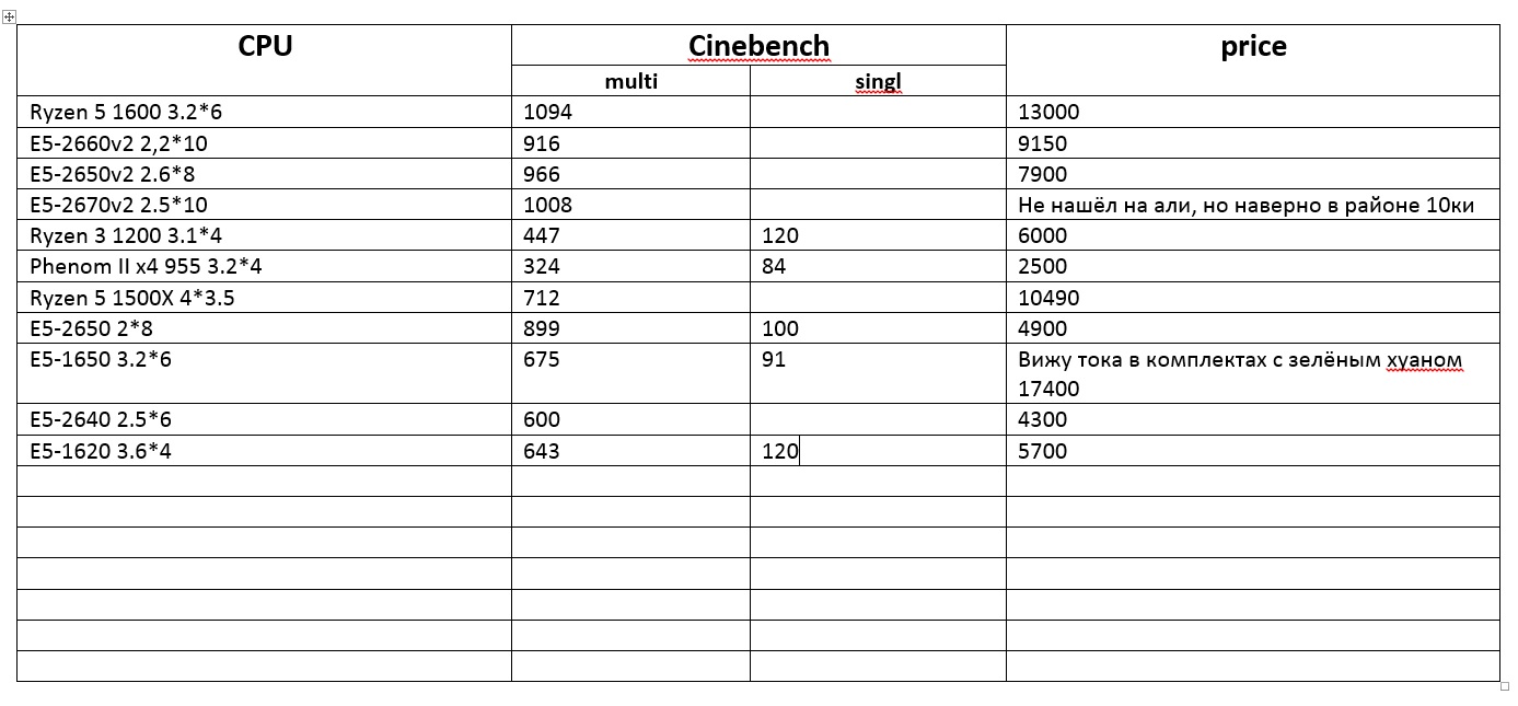 1) Такие конфигурации как Делюкс Хуанан за 8600 + 2650V2 за 8000 = ну никак меня не вкатывает сумма 16600 С зелёны Хуанаом 15600 - ну всё равно дохрена! Это грубо говоря стоит добавить 2200 и : Рязань 5-1600 за 13000 + Асус прайм Б350+ 5800 = 18800, тока опять + планка на 8 гиг ещё 6к, итого 24800. 2) Самый такой вариант цена производительность: Нехуан(за 5700, ссылка выше) + Е5-2650V1 за 4900 = 10600, но тоже не сладко что это такое, как будет работать и что максимально возможное туда воткнуть можно будет вместо 2650.