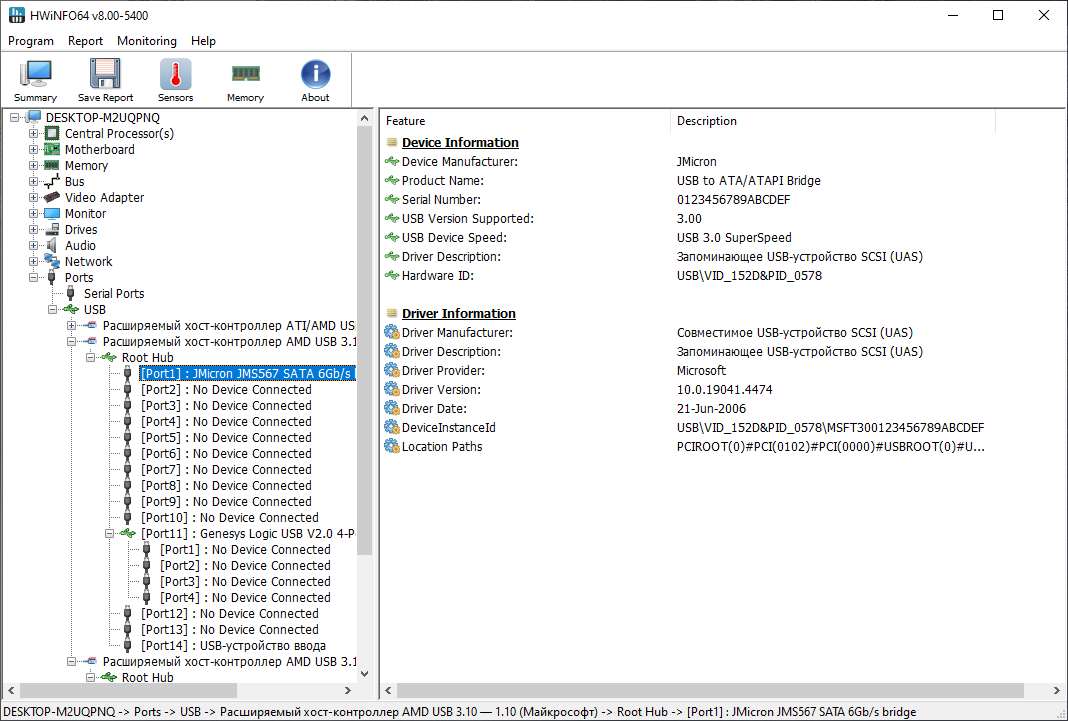 Зайди в AIDA Devices -> USB Devices и посмотри на каком порту твой диск с боксом (или в HWInfo64). У меня просто бокс 5G под диск sata (Samsung 850 EVO M.2 500GB S33DNX0J901838X), поэтому скорость ~450gb/s