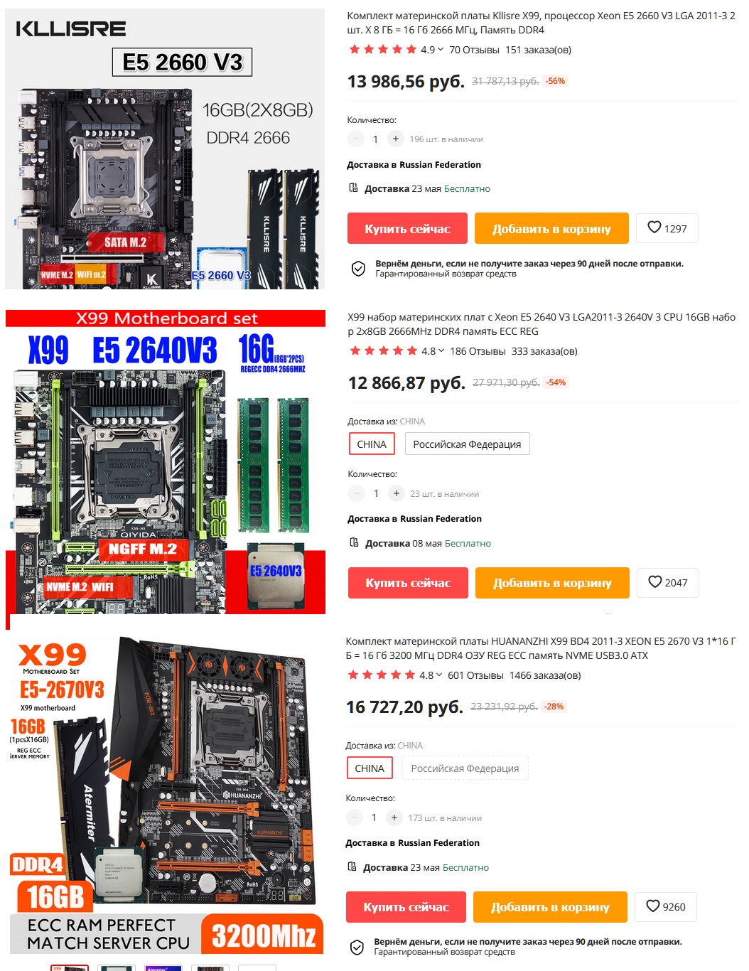 2.VEugene Продаю комплект вот такой: https://aliexpress.ru/item/100500314818 ... 1667062299 Только камни 2666 v3 Состав: HUANANZHI X99-F8D LGA2011-3 Xeon E5 2666 v3 - 2 шт. Кулера для CPU - 2 шт. 8G DDR4 2133 REG ECC память - 2 шт. 128G M.2 NVMe SSD (китайский) - 1 шт. Комплект был запасной, куплен целиком мной лично, заменены в нем только камни (изначально были 2690 v3) Все проверено, запускается. Цена 22000 руб. В Москве.