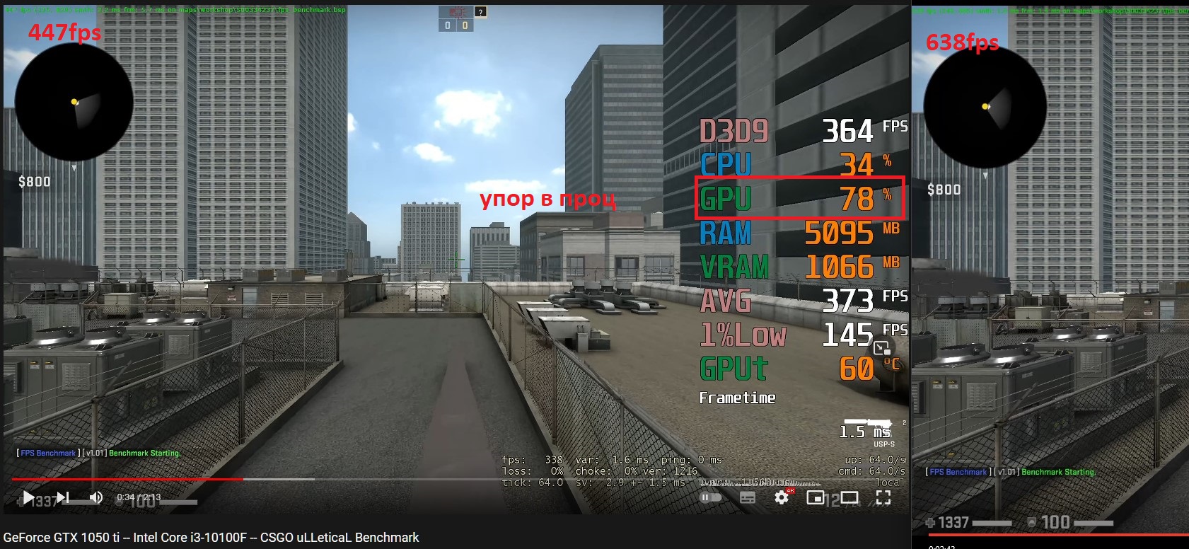 Как уже писали выше что вы не учитываете тайминги памяти и так далее,вот вам два скрина с i3-10100f.Первый с rx580 4gb второй с 1050ti.Ни в первом ни во втором случае по мониторингу нету упора в видеокарту,но fps то почти на 100 отличается,вы также не учитываете что xeon вы используете настроенный максимально на fps,отключены ядра и как минимум сделан анлок,вот почему я говорю что сравнение не корректное ,сравнивать тогда надо так же с нафаршированным i3 с настроенными таймингами и так далее.Ну сравните тогда i3 сток и xeon без анлока на одинаковых видеокартах,вот тогда тест будет честный.