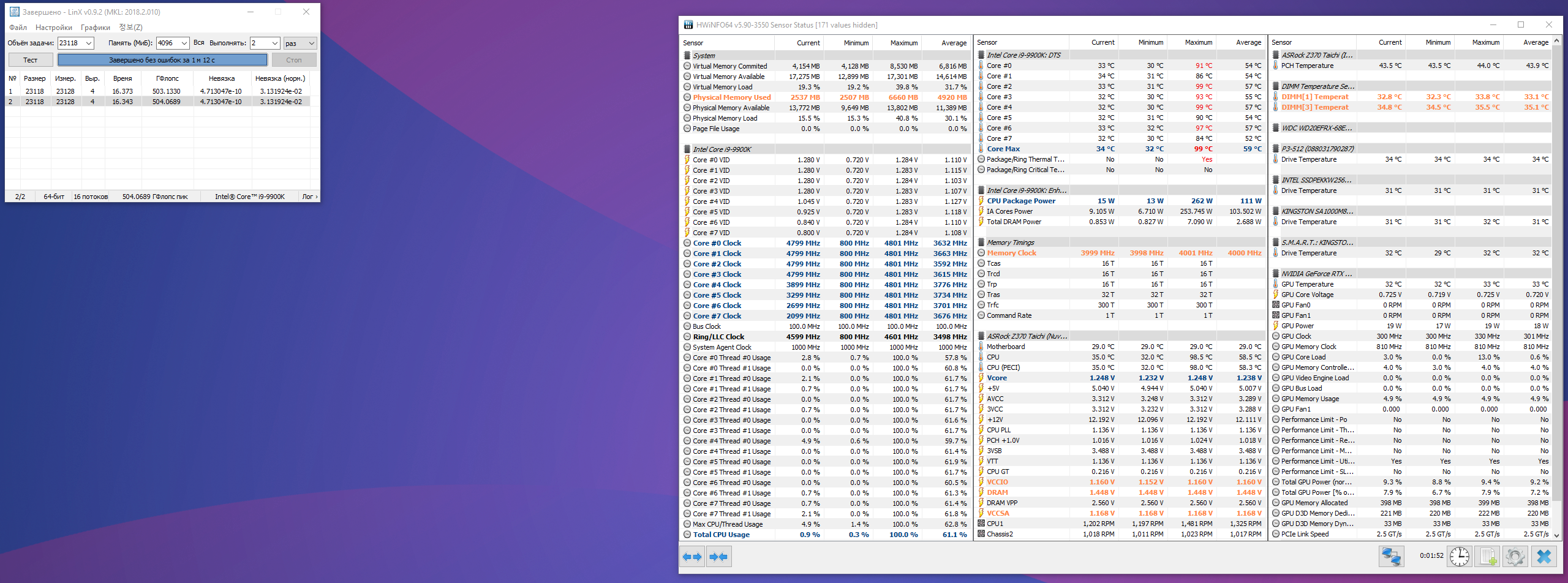 Результаты Линкс для максимального объема памяти) Прошел стабильно, VRM прогрелись до 57 градусов за 6 минут теста. Страшно представить, что с ними было бы без воды) градусов 90-100 точно. А так, можно считать систему стабильной. 5100 при напряжении 1.243 при 100% нагрузке в линке в течение 6 минут - можно считать, что золотой камушек попался