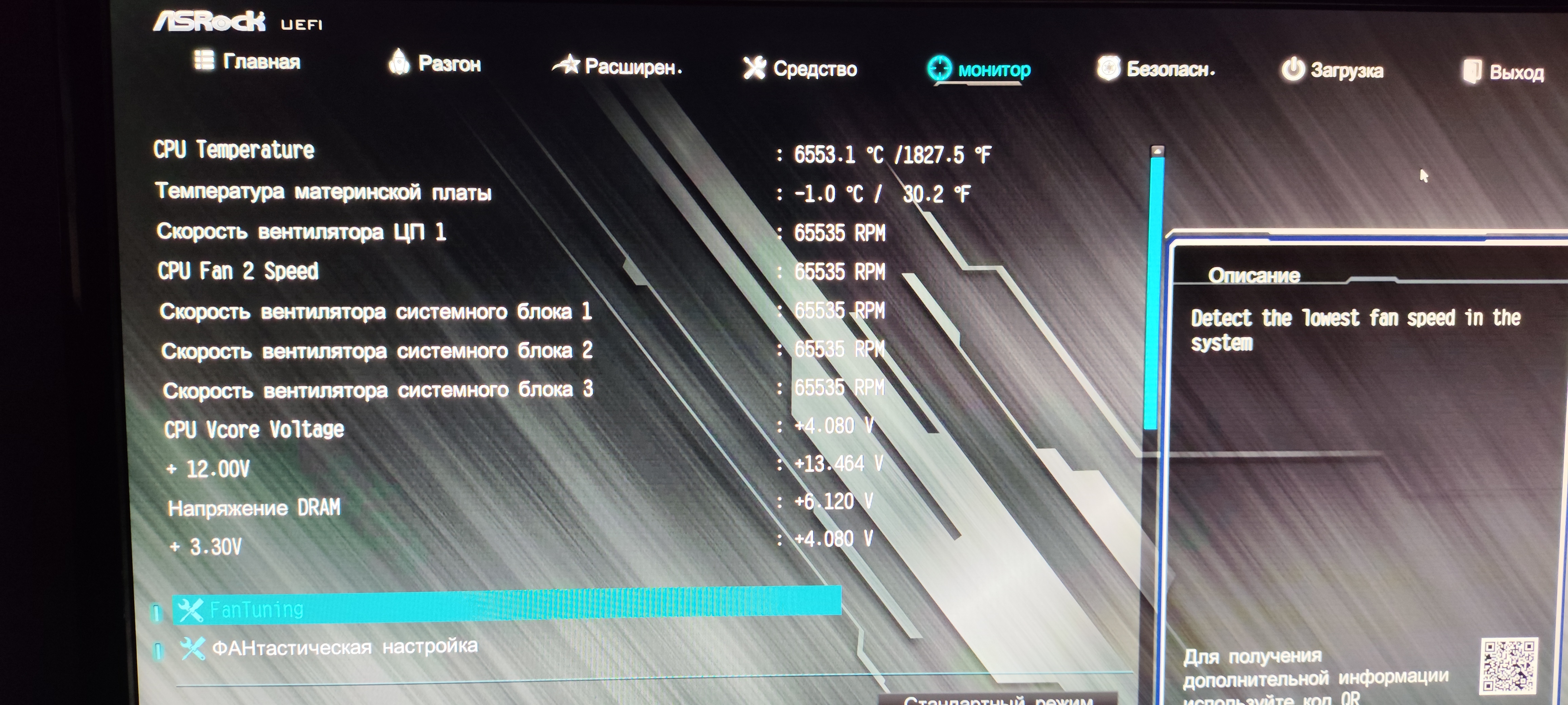 Приветствую. Купил материнскую плату (Asrock b450 pro4 r1.01) б/у . После запуска корпусные вентиляторы выдают максимальные обороты, зашёл в Биос и увидел это (скрин ниже). Регулировки вентиляторы не продаются, в биосе не реагирует,а сторонний софт показывает что их вообще нет. Так же при выключении компьютер как будто уходит в спящий режим вместо выключения. Стресс тесты проходятся отлично, Биос и Винду переустанавливал, другие драйвера тоже. Подскажите пожалуйста правильно ли понимаю что взял дохлую материнку?