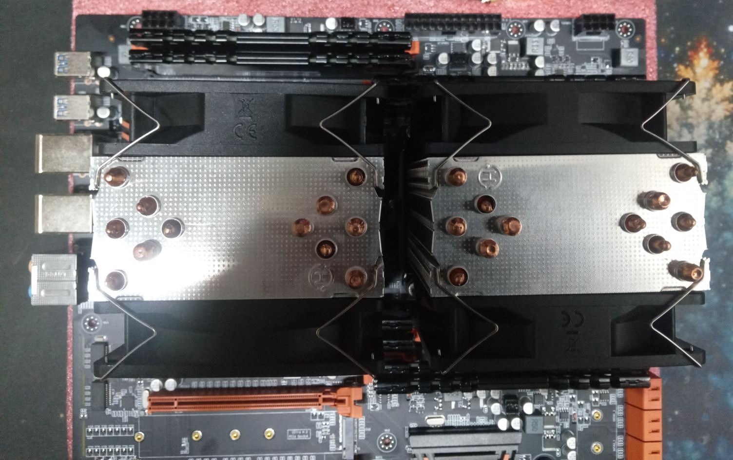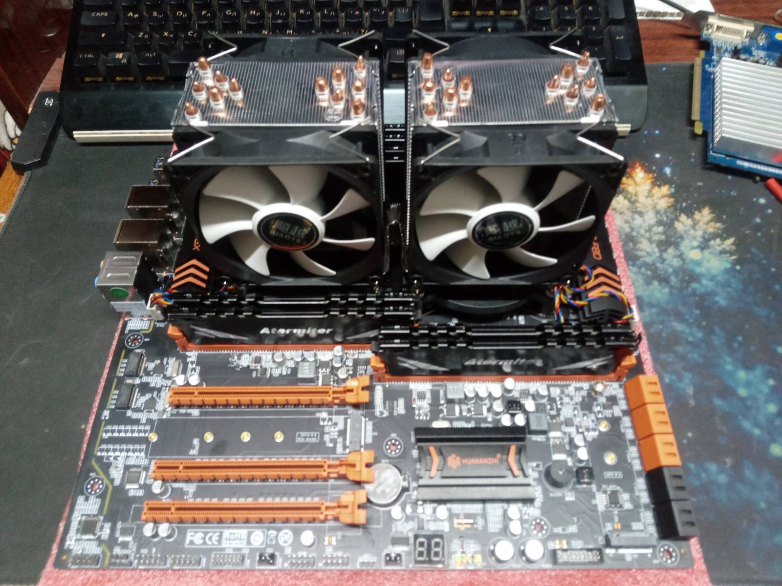 Третий минус (процессорные сокеты): Поставил вначале только первый процессор (CPU-0) - для проверки работоспослобности. Всё работает - претензий нет. А потом решил, что таки пришло время ставить второй процессор (CPU-1 or S1), и тут поймал печальку - не ставится кулер. Собственно это проблема для всех китай-матерей. Как установил? Снял вентиляторы. Открутил рамку крепления кулера (CPU-1 or S1). Собрал всё это в воздухе. И уже в таком виде прикрутил охлаждение к сокету.