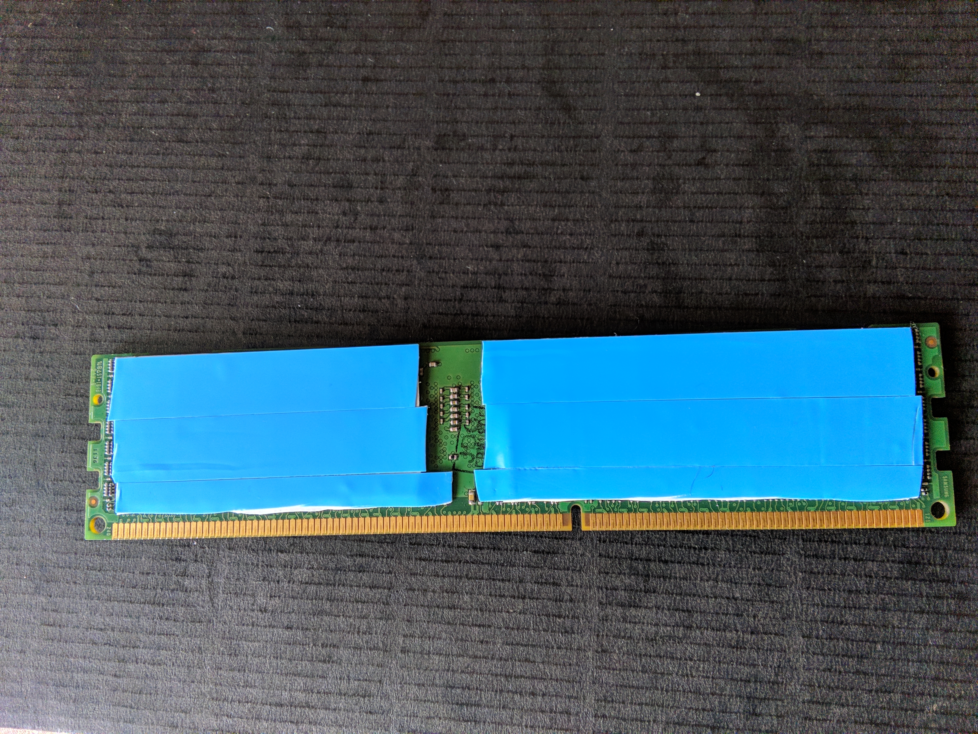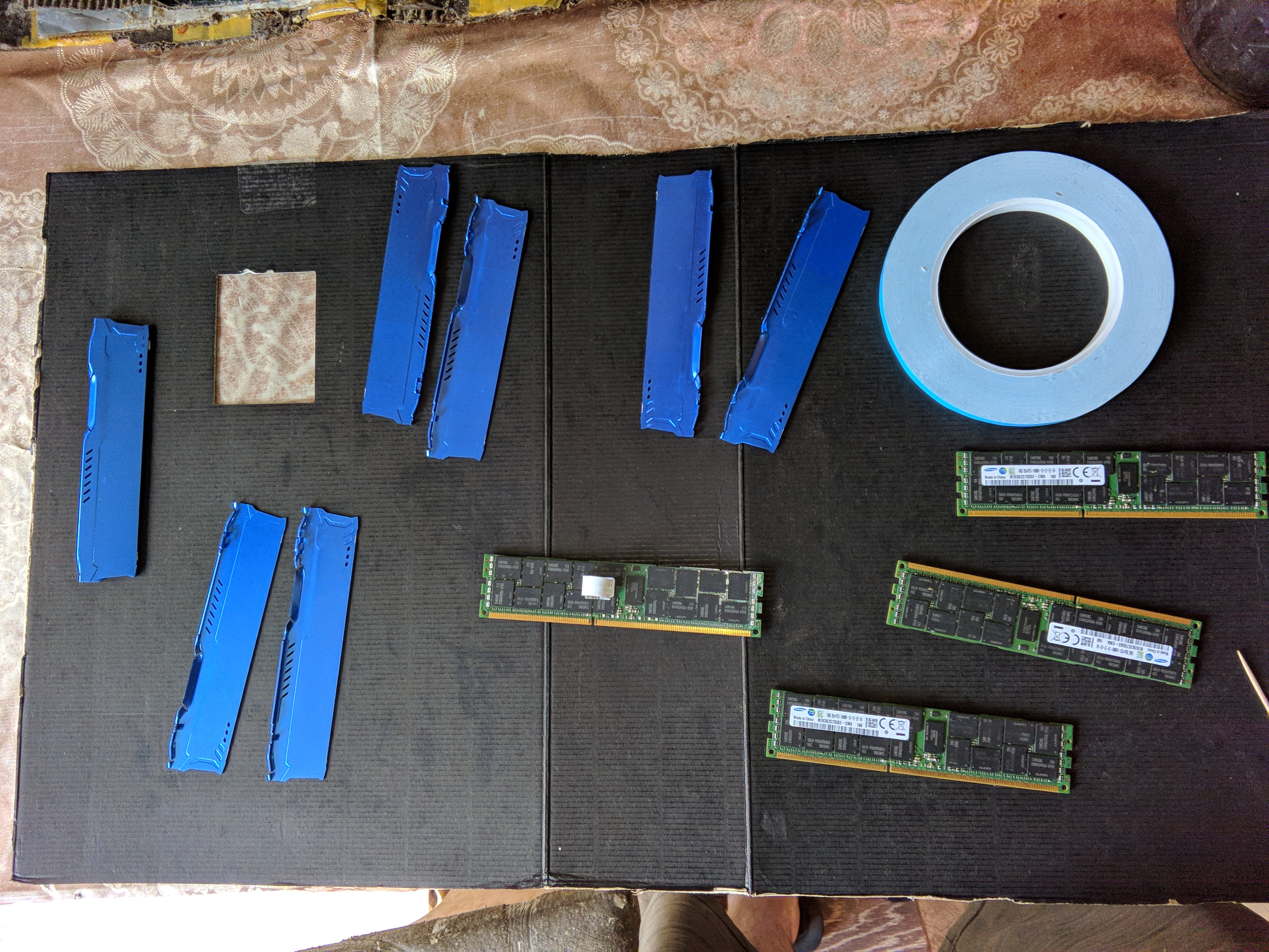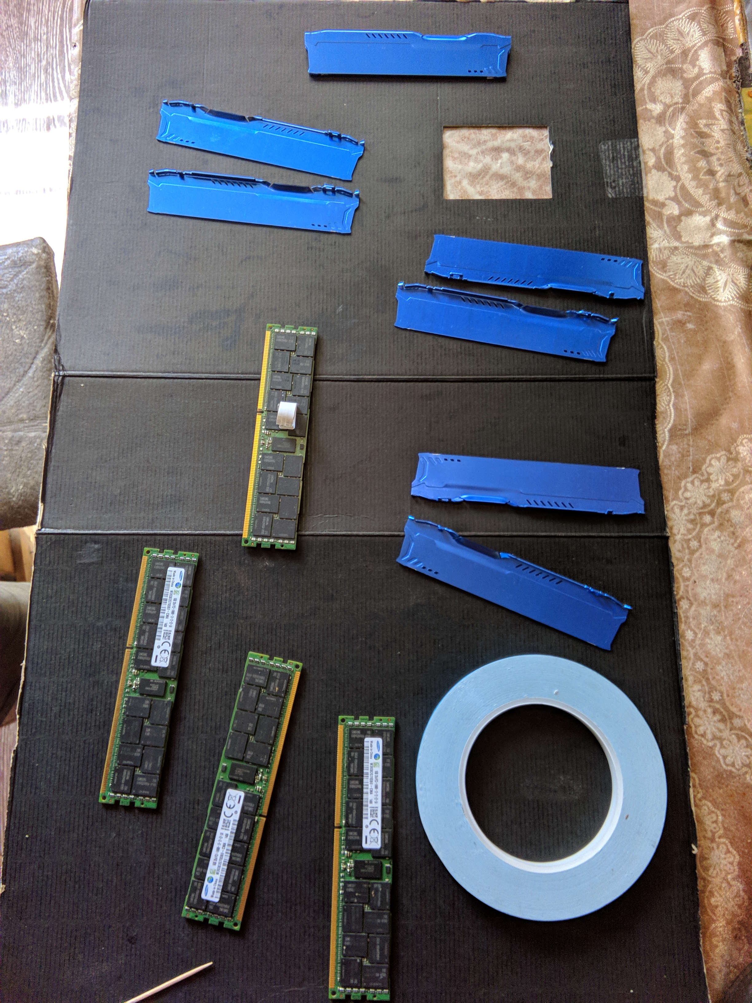 Также решит свою серверную память ddr3 обернуть в радиаторы, выбора радиаторов не было вообще, в моём городе такое вообще не продают, на авито только такое нашёл, скотч который в комплекте с ними идёт сразу на мусор он обычный вспененный, для этого дела я купил настоящий тепло-отводный скотч на который клеят лед плашки подсветки в телевизорах, толщина его 0.2мм получилось с каждой стороны плашки по 3 слоя, а под маленький чип который греется больше всех я подложил дополнительно 1 мм термо прокладку, тепло очень хорошо отводят в тесте tm5_ Xyligano&co_3Channel радики памяти очень горячие, это за счёт настоящего тепло отводного скотча.