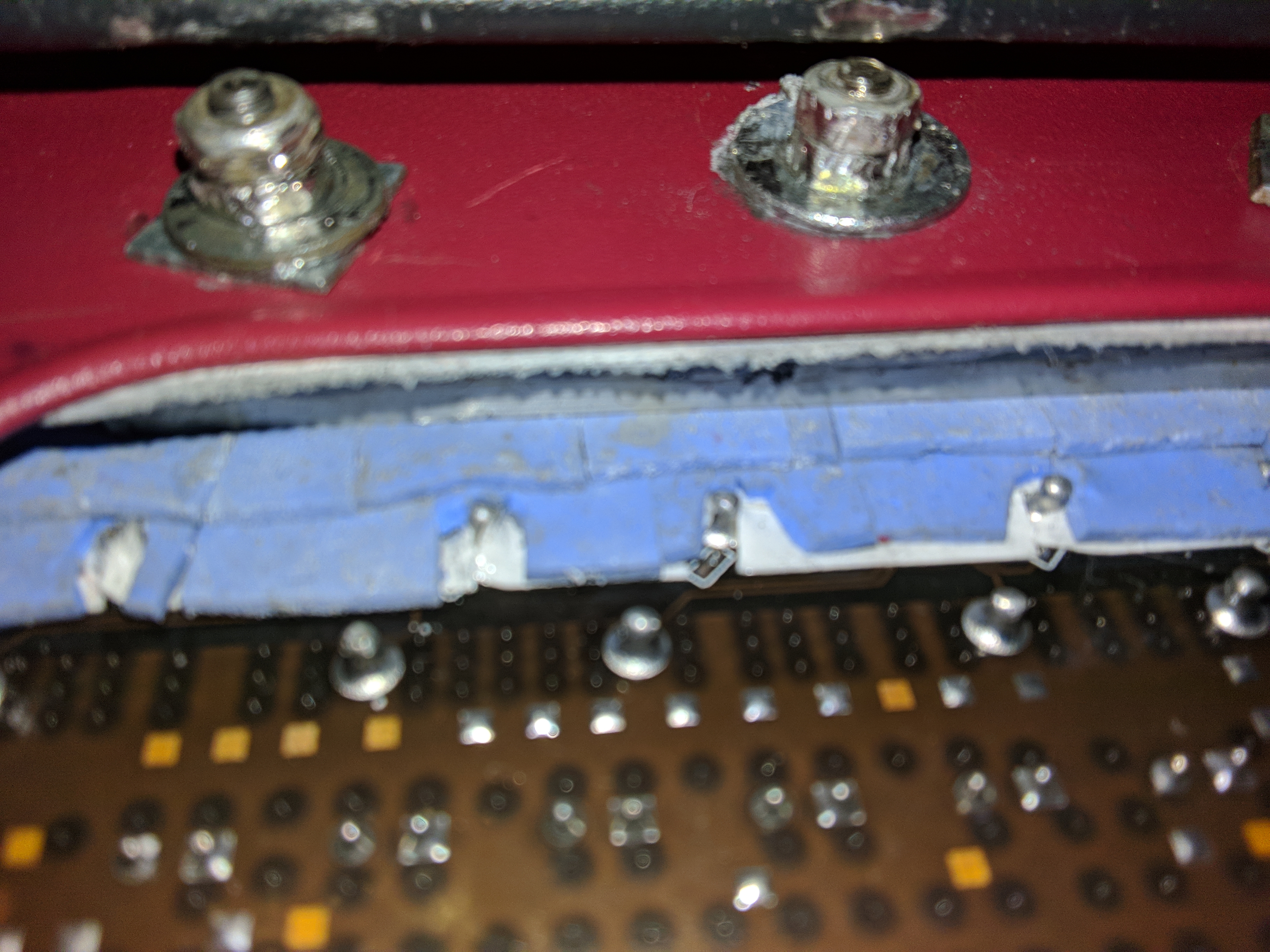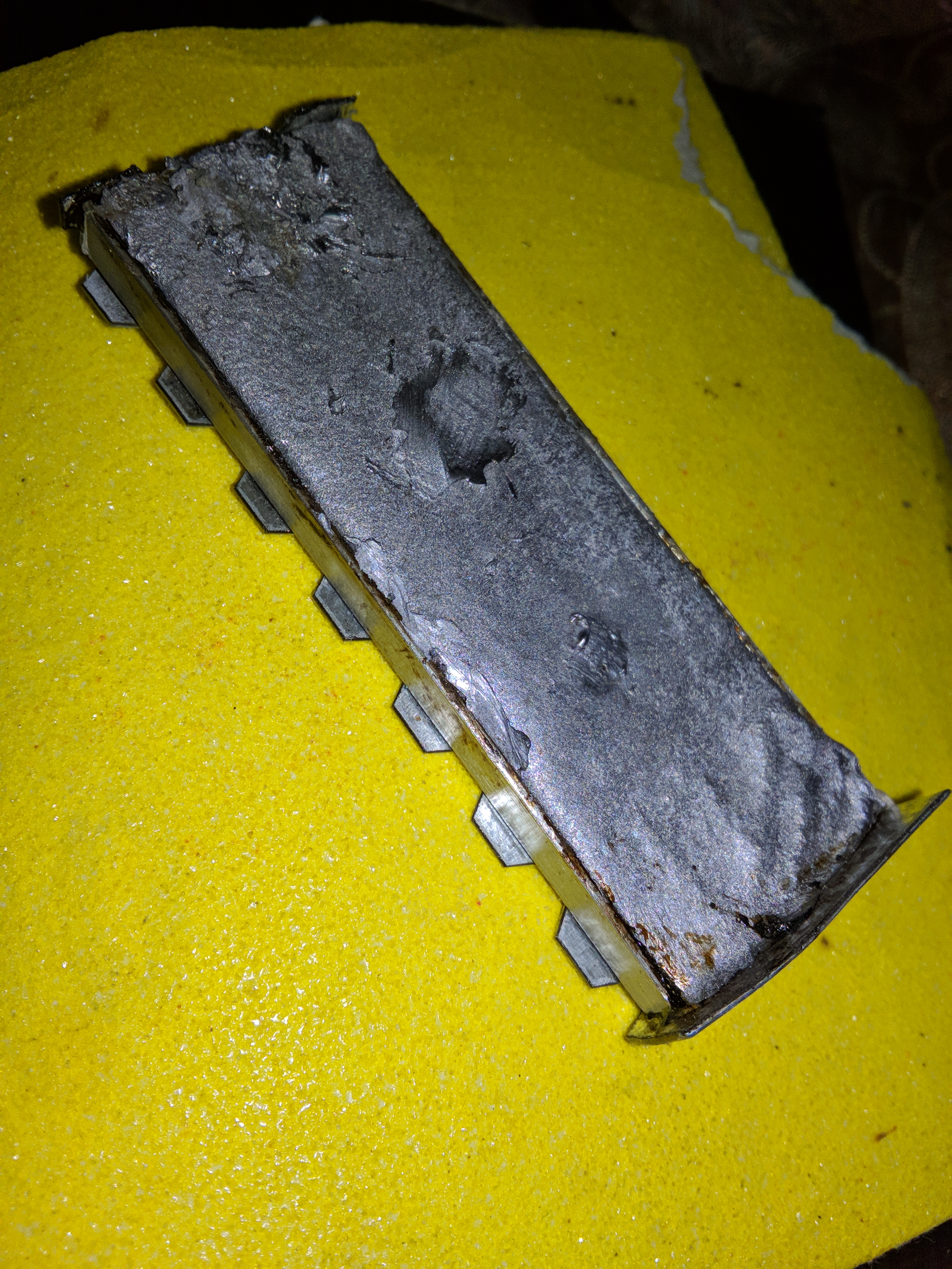 Ну и самое тяжёлое для меня это было довести до ума бэкплейт на врм материнки, так как меня предыдущий вариант не устроил хоть и давал неплохой эффект (я выкладывал ранее фотки) из за того что алюминиевая пластина пустотелая с рёбрами, я решил эти пустоты залить оловом у меня как раз был моток ненужного с алиэкспресс ужасного качества который еле плавился на высокой температуре и очень быстро остывал, после отшлифовал напильниками и получился тяжёленький литой брусок металла без пустот, то что надо для отвода и переноса тепла с врм на корпус металла, между корпусом и пластиной проклеил 3 слоя по 0.2мм тепло-отводного скотча, ещё между скотчем и пластиной промазал термопастой мх-4, дополнительно просверлил ещё два отверстия и стянул сильно 3 болтами чтоб прижим к корпусу был идеальным, без пустот. С обратной стороны врм материнки проклеил 2 слоя тепло-отводного скотча и сверху 2 мм термопрокладок, решил использовать те же что и стояли, они новые просто испачканы в термопасте. Теперь бэкплейт на врм стал то что надо, будет снимать с платы тепло и передавать на корпус, прижим термопрокладок получился идеальный и равномерный.