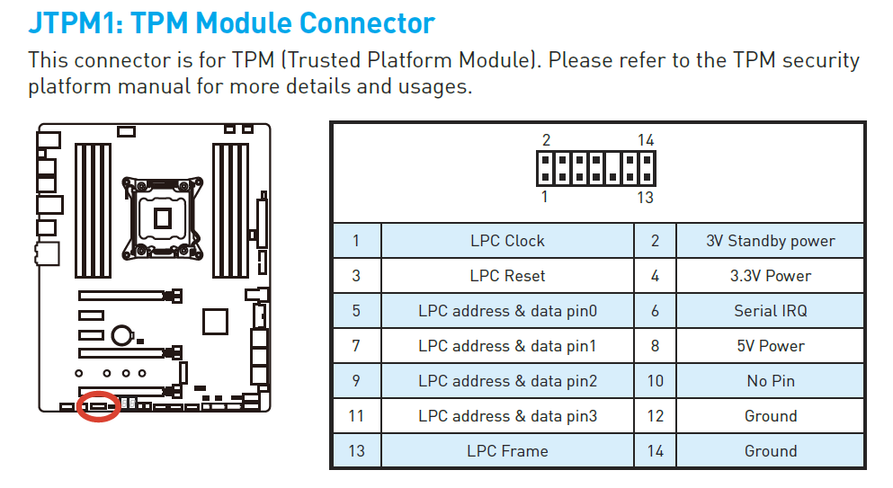 По Вашей ссылке TPM 2.0, а я так понимаю древние платы была рассчитаны на TPM 1.0. Ну допустим данный модуль заработает. Что это даст? P.S. Не подойдёт данный модуль под мою плату. На 14-pin назначения выводов совсем другие. Плюс на моей плате даже подаются три напряжения питания на данный разъём: 3.3 V, 3.3 VSB, 5 V. А на TPM 2.0 только 3.3 V, 3.3 VSB.