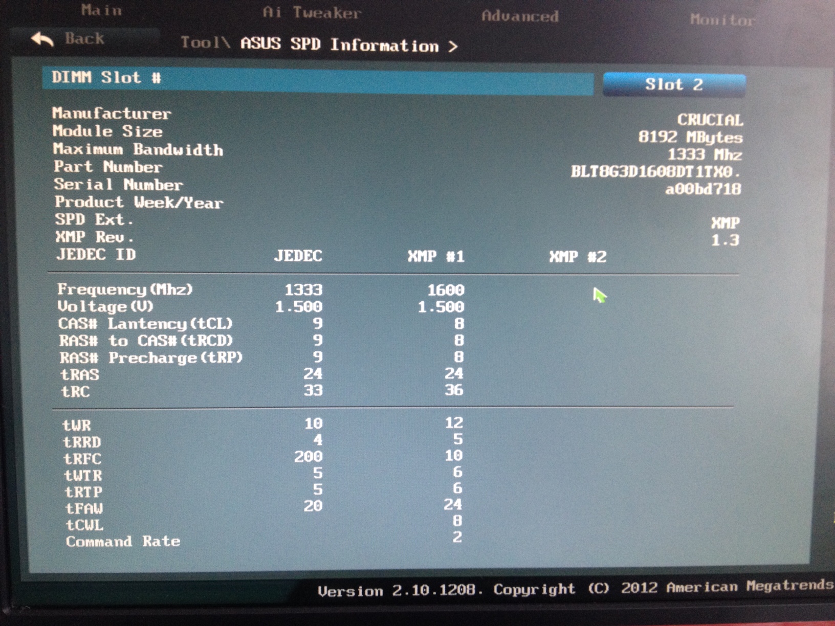 В накладной написано: память DDR3 8Gb (pc-12800) 1600MHz Crucial, Ballistix Tactical CL8 (BLT8G3D1608DT1TX0CEU) Вот скриншот с ASUS SPD #77