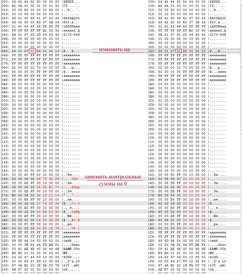 Если кому интересно, удалось найти причину того, что при прошивке модифицированного биоса встроенной утилитой Q-Flash появлялась ошибка "Invalid BIOS image". lordkag на форуме win-raid.com написал хороший пост http://www.win-raid.com/t1361f16-Flashi ... -quot.html по исправлению биос МП на чипсетах Z87 and X79. Это актуально и для 1151 Z170. Ближе к делу. В секции 56E14F88-234B-4C34-B204-299670447247, которая находится в последнем Volume биос, RAW файл начинается с сигнатуры $BDRP. В этом файле содержатся адреса и контрольные суммы разделов биос, по которым прошивальщик проверяет целостность образа. Таблица имеет смещение 0x150 относительно начала RAW файла. Все что нужно, изменить флаг на 02 и занулить контрольные суммы,