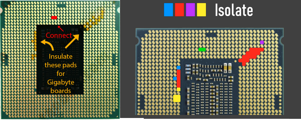 По поводу картинок, контактов и "надо" - "не надо"... Все кофе процы ревизии B0 не требуют закоротки/изоляции на любых платах. Все U0/P0 - требуют. Используйте те изображения, которые прилагаются к конкретному методу, программе или мануалу, а с вопросами обращайтесь непосредственно к их авторам. Если у вас есть подозрение, что их создатели недостаточно разбираются в теме - не пользуйтесь ими, а проверяйте всю информацию самостоятельно. Чуть выше oh00 кинул ссылку на отличное наглядное сравнение 1151 сокетов v1 vs v2.
