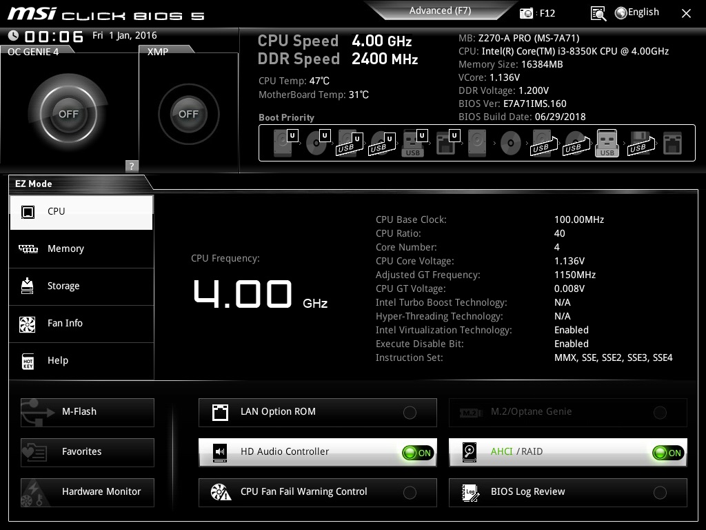 Установил модифицированный биос от svarmod для MSI Z270-A PRO. Всем рекомендую! Прошился под dos. Всё отлично. Поставил проц i3 8350k