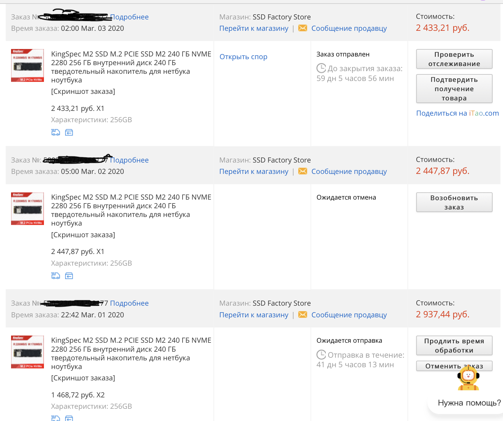 Подтверждение того что китаёсь нас дурит. Нашел самое выгодное предложение нвме 256 за 1400тр На радостях заказал две плашки. На сдедующий день смотрю продавец поднял цену до адекватных 2400 Заказал и за 2400 На следующий день продавец чуть снизил цену до чуть меньше прошлого предложения от 2400 Заказал снова и попросил отменить прошлый заказ за 2400 Продавец отказался отменить и ,выслал один заказ, но видимо робот али не дал ему отправить этот самый дорогой заказ так как он был запрошен покупателем на отмену и продавец выслал как вы думаете, какой заказ? Правильно дорогой, а где было по 1400тр не выслал. Уверен он бы выслал и совсем самый дорогой но не смог так как я запросил отмену заказа. Но он отказался отменять заказ. Сегодня я опять попросил отменить. Получите скриншот с учетом этого.
