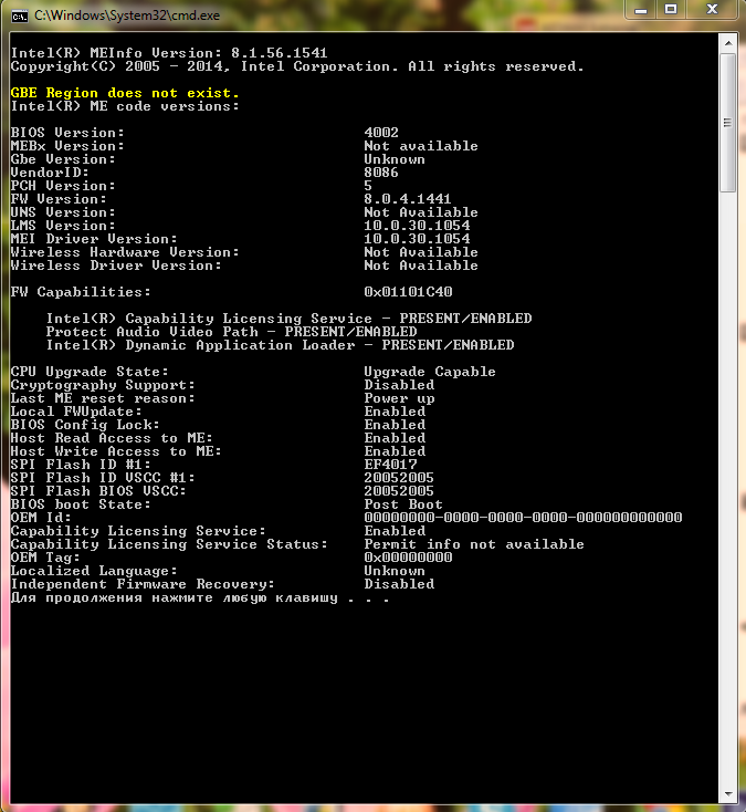 Intel(R) MEInfo Version: 9.1.20.1020 Copyright(C) 2005 - 2014, Intel Corporation. All rights reserved.