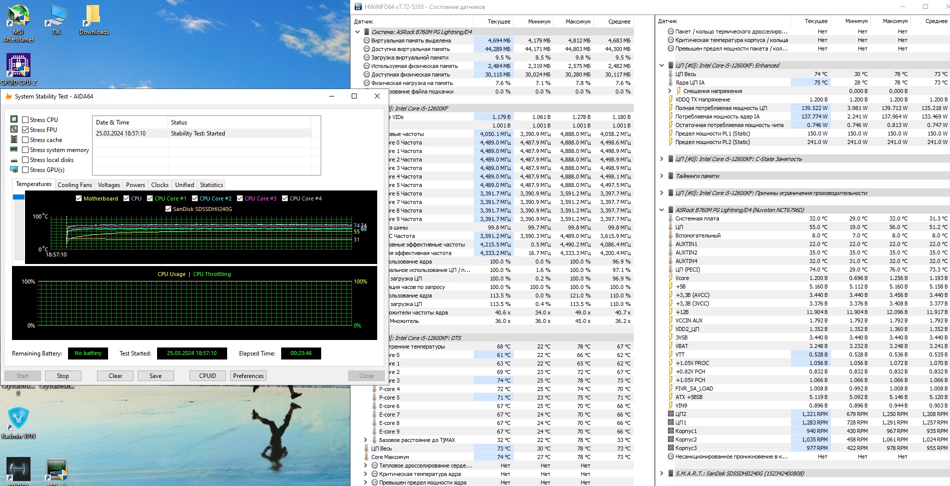 Приехала ASrock B760M PG Lightning/D4 (продавец - Озон Казахстан). Ну, за 11 500 р. в принципе сойдёт. Маленькая коробка без какой-либо защиты материнки сверху или сбоку, поэтому на всех выступающих элементах были мелкие потёртости от транспортировки. Чудо, что саму коробку нигде не проткнули и не погнули, а то сама плата лежит на тоооненькой подкладке и всё. Пломб на пакете/коробке также нет (но плата новая, никаких следов не обнаружил). Радиаторы на врм дохленькие, на защёлках, но они хотя бы есть. Фазы 7+1+1. Сразу перейду к тому, что не нашёл в интернете при выборе - тестов питальника. За 23 минуты фпу теста аиды64 с процом 12600KF (макс. потреблял 139 Вт, лимит в биосе 241/150 Вт, дефолт 241/125) VRM с обратной стороны платы максимум нагрелся до 76 градусов, и то в одном месте, рядом было в среднем 55-65 градусов. Дальше температуры не росли, в основном было 75 градусов. Замерял пирометром сразу после снятия крышки корпуса (старый дипкул тессеракт св, один кулер на вдув, два на выдув), температура в комнате 24 градуса. Так что процессоры с потреблением до 150 Вт плата потянет. Память была в XMP, 3200CL16, ещё не разгонял, так как по какой-то причине ни в одной версии биоса нет возможности изменения SA напряжения, несмотря на К-проц. Буду пытаться решать этот вопрос.