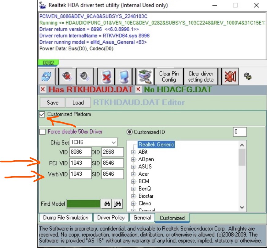 Проблем никаких, просто уточнение, что все верно установил) Единственное, что не могу подгрузить RTKHDAUD.DAT, кнопка load не вызывает окно выбора файла, который есть в Вашем архиве. И ещё момент - выложенные в предыдущем посту настройки актуальны для системы 2.0; 5.1; 7.1?