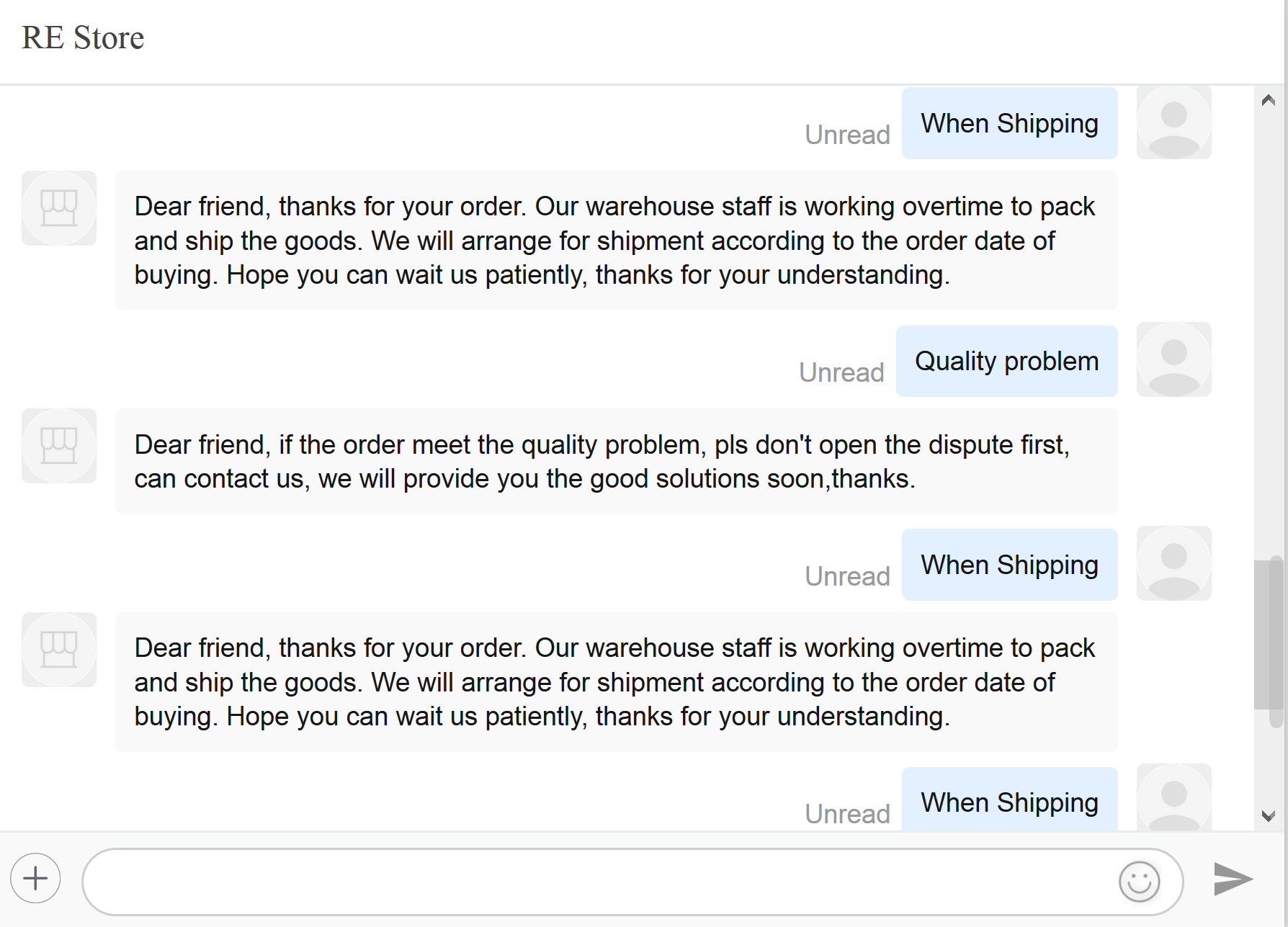 Да отписки китайцев можно помоему вообще не читать, я написал по очередной посылке у которой срок подходит в restore с просьбой расширить срок защиты (посылка отправлена, трэк есть, в таможне валяется как пить дать) - в ответ он нагадил штук 15 сообщений не в тему автоматических такого плана: