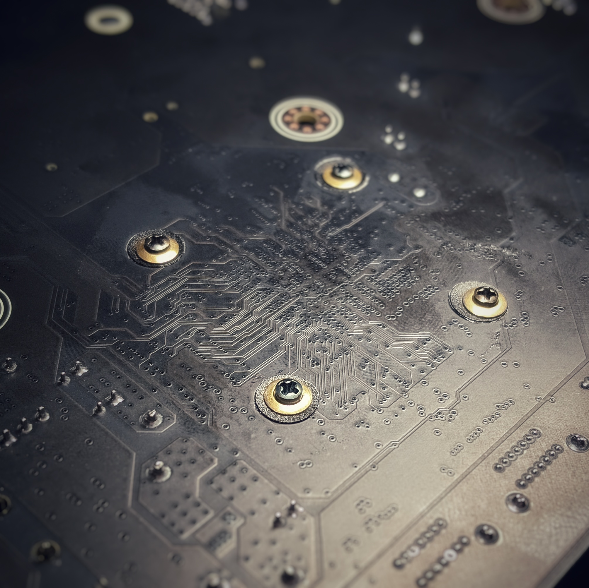 Винты заворонил в льняном масле, выточил латунные проставки, чтоб винты не провалились в отверстия на плате