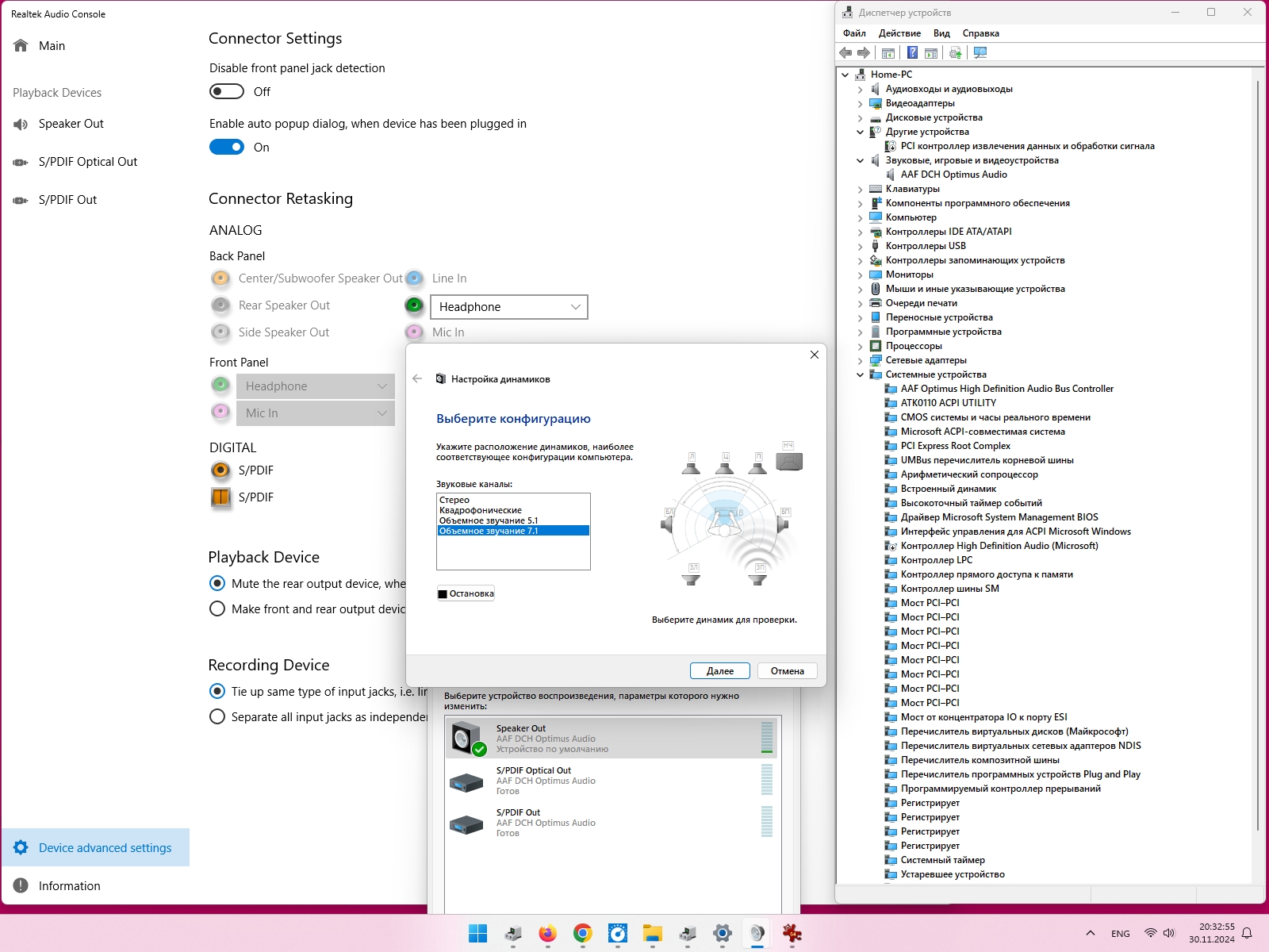 Привет. Тебе при установке нужно выбрать именно Hda, а не DCH (DCH на старых платах не правильно работают- глючат). Затем в Realtek Audio Device Tweak ввести как на скриншоте 1849/1151 и расставить галочки- сохранить и перезагрузить пк. На скрине еще дополнение. 7.1 работает без навесов - Но снавесами гораздо приятней. Win CAudio - не забудь.