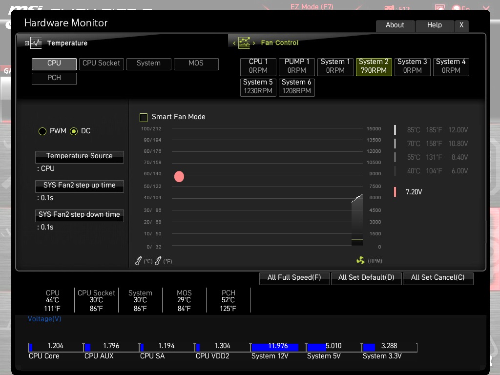 на сколько я в курсе материнские платы не умеют настраивать "кривые" напряжений. Там или повышаешь напряжение, что увеличивает обороты или понижаешь, что, соответственно, снижает обороты вентиляторов. Какая ещё кривая DC ещё и в зависимости от температуры?