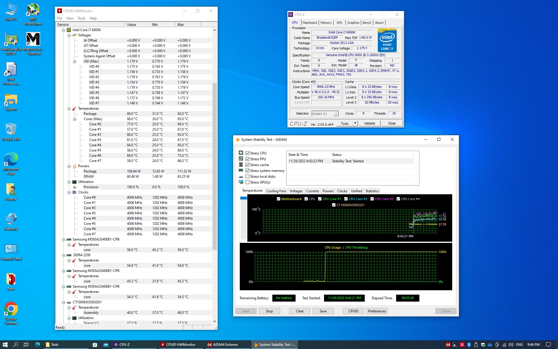 В простое, наоборот, показывает мало, 24..28 и всё ровно по всем ядрам. До 4000MHz работает вообще на родном напряжении и даже температура до 100°C не доходит